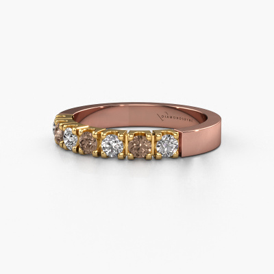 Deze 7 steens ring heeft de naam Dana 7. Dit type ring wordt een 'alliance' ring genoemd, omdat hij recht is uitgevoerd. Hierdoor kan de ring samen met andere ringen gedragen worden. Deze ring is uitgevoerd in 14 Carat rosé goud en heeft bruine diamant in combinatie met lab-grown diamant ter grootte van 0.10 crt in de band. Zoals je ziet, worden er bij deze prachtige rosé gouden alliance ring bruine diamanten naast elkaar op de ring gezet. De betekenis van alliance is letterlijk 'samenwerken'. En dat is precies wat deze edelstenen doen: samen creëren ze op de band een extra bijzonder effect bij een moderne ring! Een prachtige symboliek voor een ring, toch? Alle zorgvuldig geselecteerde bruine diamanten worden met de hand geplaatst door onze meester goudsmid. Een zeer precies werkje, dat alleen door onze unieke combinatie van puur vakmanschap en de modernste technieken het optimale effect krijgt. Alle edelstenen moeten namelijk precies op dezelfde manier geplaatst worden om het licht perfect te verspreiden. Daarom zal de goudsmid deze ring steeds weer tegen het licht houden om te zien of de bruine diamanten juist geplaatst zijn. Het vraagt een vaardige hand en veel geduld, maar het resultaat is een echt meesterstuk. En daar gaan we voor!Met veel passie gaan onze edelsmeden met jouw ring aan de slag in ons atelier, zodra je deze besteld hebt. Doordat we geen sieraden op voorraad hebben, hoeven we de voorraad niet door te berekenen in de prijs. En dat zie je terug in de prijs! We geven je graag een beste prijsgarantie.Elke dag worden nieuwe ring ontwerpen toegevoegd aan de site door ons team van talentvolle en gepassioneerde ontwerpers. Hierbij wordt ernaar gestreefd om een zo gevarieerd mogelijke collectie aan te bieden. Heb je bepaalde ideeën voor een ring, neem dan eens contact op voor een offerte. Wij doen je een aanbod wat betreft prijs en kwaliteit waar je geen nee tegen zult kunnen zeggen.Om het voor jou makkelijker te maken kun je ieder besteld sieraad binnen 30 dagen na aflevering eenvoudig weer retour sturen.'