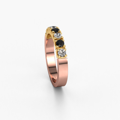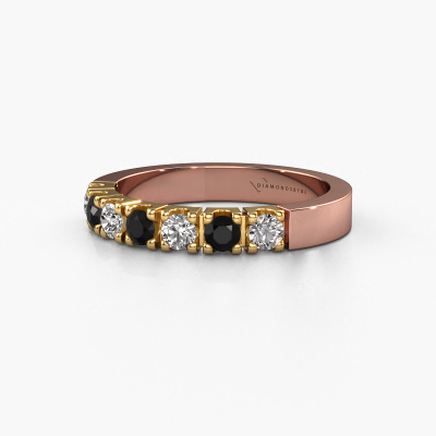 Deze 7 steens ring heeft de naam Dana 7. Dit type ring wordt een 'alliance' ring genoemd, omdat hij recht is uitgevoerd. Hierdoor kan de ring samen met andere ringen gedragen worden. Deze ring is uitgevoerd in 14 Carat rosé goud en heeft zwarte diamant in combinatie met lab-grown diamant ter grootte van 0.12 crt in de band. Zoals je ziet, worden er bij deze prachtige rosé gouden alliance ring zwarte diamanten naast elkaar op de ring gezet. De betekenis van alliance is letterlijk 'samenwerken'. En dat is precies wat deze edelstenen doen: samen creëren ze op de band een extra bijzonder effect bij een moderne ring! Een prachtige symboliek voor een ring, toch? Alle zorgvuldig geselecteerde zwarte diamanten worden met de hand geplaatst door onze meester goudsmid. Een zeer precies werkje, dat alleen door onze unieke combinatie van puur vakmanschap en de modernste technieken het optimale effect krijgt. Alle edelstenen moeten namelijk precies op dezelfde manier geplaatst worden om het licht perfect te verspreiden. Daarom zal de goudsmid deze ring steeds weer tegen het licht houden om te zien of de zwarte diamanten juist geplaatst zijn. Het vraagt een vaardige hand en veel geduld, maar het resultaat is een echt meesterstuk. En daar gaan we voor!Met veel passie gaan onze edelsmeden met jouw ring aan de slag in ons atelier, zodra je deze besteld hebt. Doordat we geen sieraden op voorraad hebben, hoeven we de voorraad niet door te berekenen in de prijs. En dat zie je terug in de prijs! We geven je graag een beste prijsgarantie.Elke dag worden nieuwe ring ontwerpen toegevoegd aan de site door ons team van talentvolle en gepassioneerde ontwerpers. Hierbij wordt ernaar gestreefd om een zo gevarieerd mogelijke collectie aan te bieden. Heb je bepaalde ideeën voor een ring, neem dan eens contact op voor een offerte. Wij doen je een aanbod wat betreft prijs en kwaliteit waar je geen nee tegen zult kunnen zeggen.Om het voor jou makkelijker te maken kun je ieder besteld sieraad binnen 30 dagen na aflevering eenvoudig weer retour sturen.'