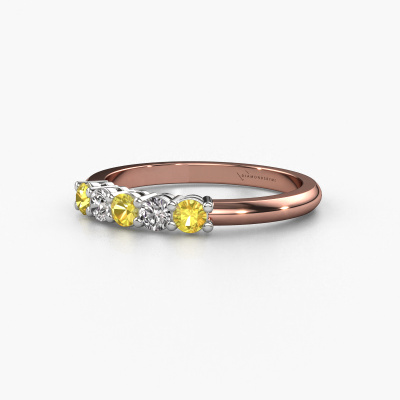 Deze 5 steens ring heeft de naam Michelle 5. Dit type ring wordt een 'alliance' ring genoemd, omdat hij recht is uitgevoerd. Hierdoor kan de ring samen met andere ringen gedragen worden. Deze ring is uitgevoerd in 14 Carat rosé goud en heeft gele saffier in combinatie met lab-grown diamant ter grootte van 3 mm in de band. Zoals je ziet, worden er bij deze prachtige rosé gouden alliance ring gele saffier naast elkaar op de ring gezet. De betekenis van alliance is letterlijk 'samenwerken'. En dat is precies wat deze edelstenen doen: samen creëren ze op de band een extra bijzonder effect bij een klassieke ring! Een prachtige symboliek voor een ring, toch? Alle zorgvuldig geselecteerde gele saffier worden met de hand geplaatst door onze meester goudsmid. Een zeer precies werkje, dat alleen door onze unieke combinatie van puur vakmanschap en de modernste technieken het optimale effect krijgt. Alle edelstenen moeten namelijk precies op dezelfde manier geplaatst worden om het licht perfect te verspreiden. Daarom zal de goudsmid deze ring steeds weer tegen het licht houden om te zien of de gele saffier juist geplaatst zijn. Het vraagt een vaardige hand en veel geduld, maar het resultaat is een echt meesterstuk. En daar gaan we voor!Ben je gebonden aan een bepaald budget? Neem gerust contact met ons op, we adviseren graag over alle mogelijkheden. Sowieso leveren wij alle ringen tegen een prijs die je nergens anders tegen komt, doordat we de ring pas vervaardigen wanneer je deze besteld. Hierdoor kunnen wij je een beste prijs garantie geven.