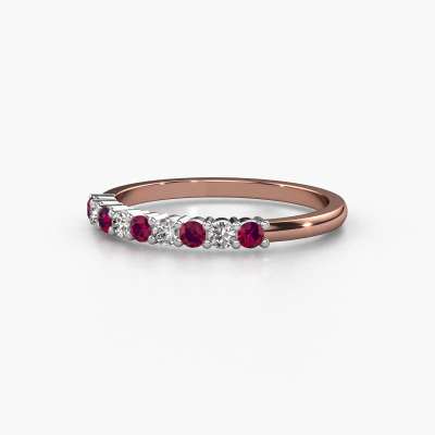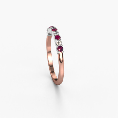 Deze 9 steens ring heeft de naam Yasmin 9. Dit type ring wordt een 'alliance' ring genoemd, omdat hij recht is uitgevoerd. Hierdoor kan de ring samen met andere ringen gedragen worden. Deze ring is uitgevoerd in 14 Carat rosé goud en heeft rhodoliet in combinatie met diamant ter grootte van 2.4 mm in de band. Zoals je ziet, worden er bij deze prachtige rosé gouden alliance ring rhodoliet naast elkaar op de ring gezet. De betekenis van alliance is letterlijk 'samenwerken'. En dat is precies wat deze edelstenen doen: samen creëren ze op de band een extra bijzonder effect bij een klassieke ring! Een prachtige symboliek voor een ring, toch? Alle zorgvuldig geselecteerde rhodoliet worden met de hand geplaatst door onze meester goudsmid. Een zeer precies werkje, dat alleen door onze unieke combinatie van puur vakmanschap en de modernste technieken het optimale effect krijgt. Alle edelstenen moeten namelijk precies op dezelfde manier geplaatst worden om het licht perfect te verspreiden. Daarom zal de goudsmid deze ring steeds weer tegen het licht houden om te zien of de rhodoliet juist geplaatst zijn. Het vraagt een vaardige hand en veel geduld, maar het resultaat is een echt meesterstuk. En daar gaan we voor!Door het gebruik van de modernste technieken, gecombineerd met ambachtelijk vakmanschap kunnen wij alle ringen zelf in ons atelier maken. Iedere ring wordt pas gemaakt nadat deze besteld is. Dit heeft als bijkomend voordeel dat we kunnen leveren tegen een prijs die je nergens anders tegenkomt.Elke dag worden nieuwe ring ontwerpen toegevoegd aan de site door ons team van talentvolle en gepassioneerde ontwerpers. Hierbij wordt ernaar gestreefd om een zo gevarieerd mogelijke collectie aan te bieden. Heb je bepaalde ideeën voor een ring, neem dan eens contact op voor een offerte. Wij doen je een aanbod wat betreft prijs en kwaliteit waar je geen nee tegen zult kunnen zeggen.Om het voor jou makkelijker te maken kun je ieder besteld sieraad binnen 30 dagen na aflevering eenvoudig weer retour sturen.'