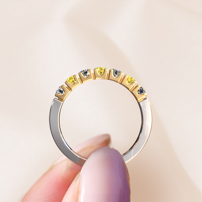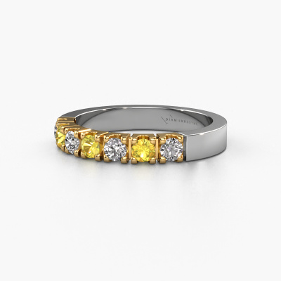 Deze 7 steens ring heeft de naam Dana 7. Dit type ring wordt een 'alliance' ring genoemd, omdat hij recht is uitgevoerd. Hierdoor kan de ring samen met andere ringen gedragen worden. Deze ring is uitgevoerd in 14 Carat witgoud en heeft gele saffier in combinatie met lab-grown diamant ter grootte van 3 mm in de band. Zoals je ziet, worden er bij deze prachtige witgouden alliance ring gele saffier naast elkaar op de ring gezet. De betekenis van alliance is letterlijk 'samenwerken'. En dat is precies wat deze edelstenen doen: samen creëren ze op de band een extra bijzonder effect bij een moderne ring! Een prachtige symboliek voor een ring, toch? Alle zorgvuldig geselecteerde gele saffier worden met de hand geplaatst door onze meester goudsmid. Een zeer precies werkje, dat alleen door onze unieke combinatie van puur vakmanschap en de modernste technieken het optimale effect krijgt. Alle edelstenen moeten namelijk precies op dezelfde manier geplaatst worden om het licht perfect te verspreiden. Daarom zal de goudsmid deze ring steeds weer tegen het licht houden om te zien of de gele saffier juist geplaatst zijn. Het vraagt een vaardige hand en veel geduld, maar het resultaat is een echt meesterstuk. En daar gaan we voor!Met veel passie gaan onze edelsmeden met jouw ring aan de slag in ons atelier, zodra je deze besteld hebt. Doordat we geen sieraden op voorraad hebben, hoeven we de voorraad niet door te berekenen in de prijs. En dat zie je terug in de prijs! We geven je graag een beste prijsgarantie.Elke dag worden nieuwe ring ontwerpen toegevoegd aan de site door ons team van talentvolle en gepassioneerde ontwerpers. Hierbij wordt ernaar gestreefd om een zo gevarieerd mogelijke collectie aan te bieden. Heb je bepaalde ideeën voor een ring, neem dan eens contact op voor een offerte. Wij doen je een aanbod wat betreft prijs en kwaliteit waar je geen nee tegen zult kunnen zeggen.Om het voor jou makkelijker te maken kun je ieder besteld sieraad binnen 30 dagen na aflevering eenvoudig weer retour sturen.'