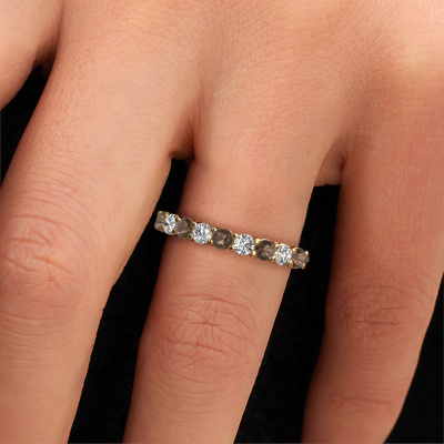 Deze 9 steens ring heeft de naam Michelle 9. Dit type ring wordt een 'alliance' ring genoemd, omdat hij recht is uitgevoerd. Hierdoor kan de ring samen met andere ringen gedragen worden. Deze ring is uitgevoerd in 14 Carat witgoud en heeft rookkwarts in combinatie met lab-grown diamant ter grootte van 2.7 mm in de band. Zoals je ziet, worden er bij deze prachtige witgouden alliance ring rookkwarts naast elkaar op de ring gezet. De betekenis van alliance is letterlijk 'samenwerken'. En dat is precies wat deze edelstenen doen: samen creëren ze op de band een extra bijzonder effect bij een klassieke ring! Een prachtige symboliek voor een ring, toch? Alle zorgvuldig geselecteerde rookkwarts worden met de hand geplaatst door onze meester goudsmid. Een zeer precies werkje, dat alleen door onze unieke combinatie van puur vakmanschap en de modernste technieken het optimale effect krijgt. Alle edelstenen moeten namelijk precies op dezelfde manier geplaatst worden om het licht perfect te verspreiden. Daarom zal de goudsmid deze ring steeds weer tegen het licht houden om te zien of de rookkwarts juist geplaatst zijn. Het vraagt een vaardige hand en veel geduld, maar het resultaat is een echt meesterstuk. En daar gaan we voor!Omdat wij zelf alle sieraden maken en direct aan jou leveren, kunnen wij je een ring leveren tegen een prijs die je nergens anders zult tegenkomen. Een ring wordt pas gemaakt als we een bestelling krijgen, hierdoor hebben wij geen dure voorraden en kunnen wij jou de beste prijs garanderen. Wij begrijpen dat het kopen van een sieraad online spannend is, en denken graag met je mee over de mogelijkheden binnen jouw budget.Elke dag worden nieuwe ring ontwerpen toegevoegd aan de site door ons team van talentvolle en gepassioneerde ontwerpers. Hierbij wordt ernaar gestreefd om een zo gevarieerd mogelijke collectie aan te bieden. Heb je bepaalde ideeën voor een ring, neem dan eens contact op voor een offerte. Wij doen je een aanbod wat betreft prijs en kwaliteit waar je geen nee tegen zult kunnen zeggen.Om het voor jou makkelijker te maken kun je ieder besteld sieraad binnen 30 dagen na aflevering eenvoudig weer retour sturen.'