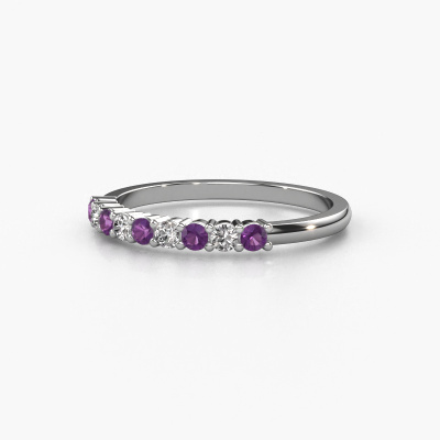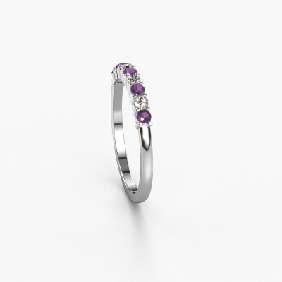 Deze 9 steens ring heeft de naam Yasmin 9. Dit type ring wordt een 'alliance' ring genoemd, omdat hij recht is uitgevoerd. Hierdoor kan de ring samen met andere ringen gedragen worden. Deze ring is uitgevoerd in 14 Carat witgoud en heeft amethist in combinatie met diamant ter grootte van 2.4 mm in de band. Zoals je ziet, worden er bij deze prachtige witgouden alliance ring amethisten naast elkaar op de ring gezet. De betekenis van alliance is letterlijk 'samenwerken'. En dat is precies wat deze edelstenen doen: samen creëren ze op de band een extra bijzonder effect bij een klassieke ring! Een prachtige symboliek voor een ring, toch? Alle zorgvuldig geselecteerde amethisten worden met de hand geplaatst door onze meester goudsmid. Een zeer precies werkje, dat alleen door onze unieke combinatie van puur vakmanschap en de modernste technieken het optimale effect krijgt. Alle edelstenen moeten namelijk precies op dezelfde manier geplaatst worden om het licht perfect te verspreiden. Daarom zal de goudsmid deze ring steeds weer tegen het licht houden om te zien of de amethisten juist geplaatst zijn. Het vraagt een vaardige hand en veel geduld, maar het resultaat is een echt meesterstuk. En daar gaan we voor!Door het gebruik van de modernste technieken, gecombineerd met ambachtelijk vakmanschap kunnen wij alle ringen zelf in ons atelier maken. Iedere ring wordt pas gemaakt nadat deze besteld is. Dit heeft als bijkomend voordeel dat we kunnen leveren tegen een prijs die je nergens anders tegenkomt.Elke dag worden nieuwe ring ontwerpen toegevoegd aan de site door ons team van talentvolle en gepassioneerde ontwerpers. Hierbij wordt ernaar gestreefd om een zo gevarieerd mogelijke collectie aan te bieden. Heb je bepaalde ideeën voor een ring, neem dan eens contact op voor een offerte. Wij doen je een aanbod wat betreft prijs en kwaliteit waar je geen nee tegen zult kunnen zeggen.Om het voor jou makkelijker te maken kun je ieder besteld sieraad binnen 30 dagen na aflevering eenvoudig weer retour sturen.'