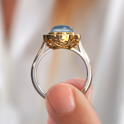 Wil je een mooie, royale ring met een enkele edelsteen als eyecatcher? Wat denk je dan van deze Alisa ring? De Alisa ring zie je hier afgebeeld in witgoud met een prachtige 8 mm ronde cabochon aquamarijn. De aquamarijn wordt met zeer zorgvuldig uitgezocht door onze leveranciers van aquamarijn, en daarna volgens het oude ambacht door de goudsmid geplaatst in de ring. Deze wordt tot in het kleinste detail afgewerkt en gepolijst totdat een unieke ring is ontstaan met een prachtige aquamarijn. Speciaal voor jou vervaardigd!Het mooiste cadeau wat je kunt geven, is een zelfontworpen fantasie ring. Ons team van gepassioneerde goudsmeden voegt iedere dag de mooiste nieuwe ontwerpen toe. En elk ontwerp kun je naar jouw wens aanpassen. Zo heb je de keuze welk edelmetaal gebruikt wordt, en kun je de kleur kiezen van de edelstenen. Zo wordt jouw fantasie Alisa ring ontwerp geheel uniek!Wil je jouw Alisa ring laten graveren, dan kun je dit doorgeven bij je bestelling. Wij zorgen ervoor dat je ring helemaal naar wens wordt vervaardigd. Ben je gebonden aan een bepaald budget? Neem gerust contact met ons op, we adviseren graag over alle mogelijkheden. Sowieso leveren wij alle ringen tegen een prijs die je nergens anders tegen komt, doordat we de ring pas vervaardigen wanneer je deze besteld. Hierdoor kunnen wij je een beste prijs garantie geven.Om het voor jou makkelijker te maken kun je ieder besteld sieraad binnen 30 dagen na aflevering eenvoudig weer retour sturen.Heb je vragen, dan kun je altijd een kijkje nemen bij onze veelgestelde vragen. Kom je er niet uit, of zie je het antwoord op je vraag er niet bij staan, neem dan gerust contact op met het DiamondsByMe team!