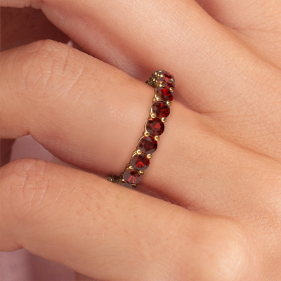 Deze aanschuifring heeft de naam Michelle full 3.0, dit type aanschuifring noemen we een eternity ring, hierbij worden volledig rondom de aanschuifring edelstenen gezet. Deze aanschuifring uitgevoerd in 14 Carat goud heeft allemaal kleine granaat van 3 mm. De schitterende granaat zijn allen identiek qua grootte en worden rondom in de band van de aanschuifring geplaatst. Alle granaat worden zeer zorgvuldig geselecteerd, juist omdat ze zo identiek mogelijk moeten zijn om het beste resultaat te creëren op deze ring. Onze goudsmid plaatst alle granaat heel precies met de hand worden geplaatst, en daardoor kan het eternity effect versterkt worden. Dit is de passie die onze goudsmeden drijft: het creëren van de perfecte ring. Dat is het mooie van ons ambacht! Het resultaat is een prachtige klassieke gouden ring, waarin de granaat eindeloos door lijken te lopen. Het perfecte symbool voor jouw oneindige liefde voor haar! Hoe bijzonder is dat!Omdat wij zelf alle sieraden maken en direct aan jou leveren, kunnen wij je een ring leveren tegen een prijs die je nergens anders zult tegenkomen. Een ring wordt pas gemaakt als we een bestelling krijgen, hierdoor hebben wij geen dure voorraden en kunnen wij jou de beste prijs garanderen. Wij begrijpen dat het kopen van een sieraad online spannend is, en denken graag met je mee over de mogelijkheden binnen jouw budget.Onze talentvolle ontwerpers voegen elke dag nieuwe designs toe aan de website, en werken samen om tot een zo gevarieerd mogelijke collectie te komen met de mooiste sieraden. Wil je een ring laten maken naar eigen ontwerp, neem dan eens contact met ons op voor een offerte. Graag doen wij je een aanbod, waarvan wij denken dat je wat betreft kwaliteit en prijs versteld zult staan.Om het voor jou makkelijker te maken kun je ieder besteld sieraad binnen 30 dagen na aflevering eenvoudig weer retour sturen.