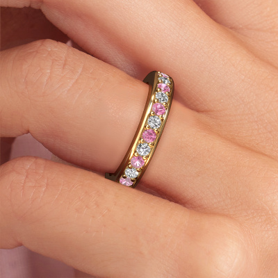 Deze aanschuifring heeft de naam Nienke, dit type aanschuifring noemen we een eternity ring, hierbij worden volledig rondom de aanschuifring edelstenen gezet. Deze aanschuifring uitgevoerd in 14 Carat goud heeft allemaal kleine roze saffier van 2.2 mm. De schitterende roze saffier zijn allen identiek qua grootte en worden rondom in de band van de aanschuifring geplaatst. Alle roze saffier worden zeer zorgvuldig geselecteerd, juist omdat ze zo identiek mogelijk moeten zijn om het beste resultaat te creëren op deze ring. Onze goudsmid plaatst alle roze saffier heel precies met de hand worden geplaatst, en daardoor kan het eternity effect versterkt worden. Dit is de passie die onze goudsmeden drijft: het creëren van de perfecte ring. Dat is het mooie van ons ambacht! Het resultaat is een prachtige moderne gouden ring, waarin de roze saffier eindeloos door lijken te lopen. Het perfecte symbool voor jouw oneindige liefde voor haar! Hoe bijzonder is dat!Onze goudsmeden vervaardigen pas je ring, zodra je deze besteld hebt. We hebben geen voorraden. Het voordeel hiervan is dat we de voorraad niet door hoeven te berekenen in de prijs, en wij daardoor sieraden kunnen leveren tegen een bijzonder lage prijs.Elke dag worden nieuwe ring ontwerpen toegevoegd aan de site door ons team van talentvolle en gepassioneerde ontwerpers. Hierbij wordt ernaar gestreefd om een zo gevarieerd mogelijke collectie aan te bieden. Heb je bepaalde ideeën voor een ring, neem dan eens contact op voor een offerte. Wij doen je een aanbod wat betreft prijs en kwaliteit waar je geen nee tegen zult kunnen zeggen.Om het voor jou makkelijker te maken kun je ieder besteld sieraad binnen 30 dagen na aflevering eenvoudig weer retour sturen.