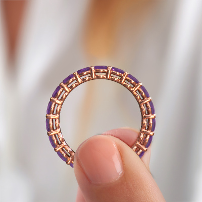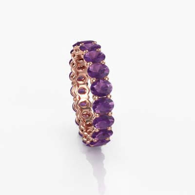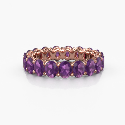 Deze aanschuifring heeft de naam Heddy OVL 3.5x4.5, dit type aanschuifring noemen we een eternity ring, hierbij worden volledig rondom de aanschuifring edelstenen gezet. Deze aanschuifring uitgevoerd in 14 Carat rosé goud heeft allemaal kleine amethisten van 4.5x3.5 mm. De schitterende amethisten zijn allen identiek qua grootte en worden rondom in de band van de aanschuifring geplaatst. Alle amethisten worden zeer zorgvuldig geselecteerd, juist omdat ze zo identiek mogelijk moeten zijn om het beste resultaat te creëren op deze ring. Onze goudsmid plaatst alle amethisten heel precies met de hand worden geplaatst, en daardoor kan het eternity effect versterkt worden. Dit is de passie die onze goudsmeden drijft: het creëren van de perfecte ring. Dat is het mooie van ons ambacht! Het resultaat is een prachtige fantasie rosé gouden ring, waarin de amethisten eindeloos door lijken te lopen. Het perfecte symbool voor jouw oneindige liefde voor haar! Hoe bijzonder is dat!Door het gebruik van de modernste technieken, gecombineerd met ambachtelijk vakmanschap kunnen wij alle ringen zelf in ons atelier maken. Iedere ring wordt pas gemaakt nadat deze besteld is. Dit heeft als bijkomend voordeel dat we kunnen leveren tegen een prijs die je nergens anders tegenkomt.Elke dag worden nieuwe ring ontwerpen toegevoegd aan de site door ons team van talentvolle en gepassioneerde ontwerpers. Hierbij wordt ernaar gestreefd om een zo gevarieerd mogelijke collectie aan te bieden. Heb je bepaalde ideeën voor een ring, neem dan eens contact op voor een offerte. Wij doen je een aanbod wat betreft prijs en kwaliteit waar je geen nee tegen zult kunnen zeggen.Om het voor jou makkelijker te maken kun je ieder besteld sieraad binnen 30 dagen na aflevering eenvoudig weer retour sturen.