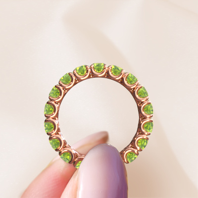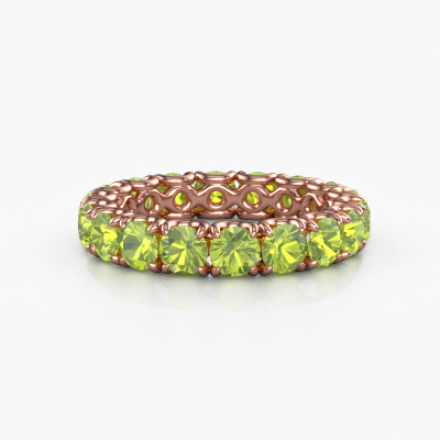 Deze aanschuifring heeft de naam Estee 3.7, dit type aanschuifring noemen we een eternity ring, hierbij worden volledig rondom de aanschuifring edelstenen gezet. Deze aanschuifring uitgevoerd in 14 Carat rosé goud heeft allemaal kleine peridoot van 3.7 mm. De schitterende peridoot zijn allen identiek qua grootte en worden rondom in de band van de aanschuifring geplaatst. Alle peridoot worden zeer zorgvuldig geselecteerd, juist omdat ze zo identiek mogelijk moeten zijn om het beste resultaat te creëren op deze ring. Onze goudsmid plaatst alle peridoot heel precies met de hand worden geplaatst, en daardoor kan het eternity effect versterkt worden. Dit is de passie die onze goudsmeden drijft: het creëren van de perfecte ring. Dat is het mooie van ons ambacht! Het resultaat is een prachtige klassieke rosé gouden ring, waarin de peridoot eindeloos door lijken te lopen. Het perfecte symbool voor jouw oneindige liefde voor haar! Hoe bijzonder is dat!Met veel passie gaan onze edelsmeden met jouw ring aan de slag in ons atelier, zodra je deze besteld hebt. Doordat we geen sieraden op voorraad hebben, hoeven we de voorraad niet door te berekenen in de prijs. En dat zie je terug in de prijs! We geven je graag een beste prijsgarantie.Onze talentvolle ontwerpers voegen elke dag nieuwe designs toe aan de website, en werken samen om tot een zo gevarieerd mogelijke collectie te komen met de mooiste sieraden. Wil je een ring laten maken naar eigen ontwerp, neem dan eens contact met ons op voor een offerte. Graag doen wij je een aanbod, waarvan wij denken dat je wat betreft kwaliteit en prijs versteld zult staan.Om het voor jou makkelijker te maken kun je ieder besteld sieraad binnen 30 dagen na aflevering eenvoudig weer retour sturen.