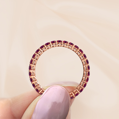 Deze aanschuifring heeft de naam Michelle full 2.0, dit type aanschuifring noemen we een eternity ring, hierbij worden volledig rondom de aanschuifring edelstenen gezet. Deze aanschuifring uitgevoerd in 14 Carat rosé goud heeft allemaal kleine rhodoliet van 2 mm. De schitterende rhodoliet zijn allen identiek qua grootte en worden rondom in de band van de aanschuifring geplaatst. Alle rhodoliet worden zeer zorgvuldig geselecteerd, juist omdat ze zo identiek mogelijk moeten zijn om het beste resultaat te creëren op deze ring. Onze goudsmid plaatst alle rhodoliet heel precies met de hand worden geplaatst, en daardoor kan het eternity effect versterkt worden. Dit is de passie die onze goudsmeden drijft: het creëren van de perfecte ring. Dat is het mooie van ons ambacht! Het resultaat is een prachtige klassieke rosé gouden ring, waarin de rhodoliet eindeloos door lijken te lopen. Het perfecte symbool voor jouw oneindige liefde voor haar! Hoe bijzonder is dat!Door het gebruik van de modernste technieken, gecombineerd met ambachtelijk vakmanschap kunnen wij alle ringen zelf in ons atelier maken. Iedere ring wordt pas gemaakt nadat deze besteld is. Dit heeft als bijkomend voordeel dat we kunnen leveren tegen een prijs die je nergens anders tegenkomt.Iedere dag worden nieuwe sieraad ontwerpen toegevoegd aan de website. Ons team van gepassioneerde designers streeft ernaar om tot de mooiste ontwerpen te komen, en een zo gevarieerd mogelijk aanbod. Heb je ergens een ring gezien welke je wilt laten maken, stuur ons dan bericht. Wij sturen je graag een offerte toe. Hierin bieden wij de beste prijs en kwaliteit. Je zult dit zeker niet kunnen afslaan!Om het voor jou makkelijker te maken kun je ieder besteld sieraad binnen 30 dagen na aflevering eenvoudig weer retour sturen.