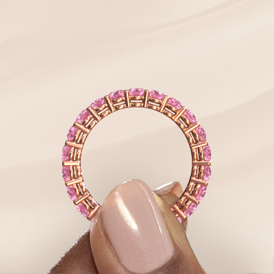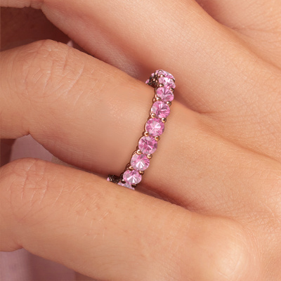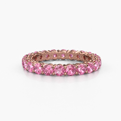 Deze aanschuifring heeft de naam Michelle full 3.0, dit type aanschuifring noemen we een eternity ring, hierbij worden volledig rondom de aanschuifring edelstenen gezet. Deze aanschuifring uitgevoerd in 14 Carat rosé goud heeft allemaal kleine roze saffier van 3 mm. De schitterende roze saffier zijn allen identiek qua grootte en worden rondom in de band van de aanschuifring geplaatst. Alle roze saffier worden zeer zorgvuldig geselecteerd, juist omdat ze zo identiek mogelijk moeten zijn om het beste resultaat te creëren op deze ring. Onze goudsmid plaatst alle roze saffier heel precies met de hand worden geplaatst, en daardoor kan het eternity effect versterkt worden. Dit is de passie die onze goudsmeden drijft: het creëren van de perfecte ring. Dat is het mooie van ons ambacht! Het resultaat is een prachtige klassieke rosé gouden ring, waarin de roze saffier eindeloos door lijken te lopen. Het perfecte symbool voor jouw oneindige liefde voor haar! Hoe bijzonder is dat!Omdat wij zelf alle sieraden maken en direct aan jou leveren, kunnen wij je een ring leveren tegen een prijs die je nergens anders zult tegenkomen. Een ring wordt pas gemaakt als we een bestelling krijgen, hierdoor hebben wij geen dure voorraden en kunnen wij jou de beste prijs garanderen. Wij begrijpen dat het kopen van een sieraad online spannend is, en denken graag met je mee over de mogelijkheden binnen jouw budget.Onze talentvolle ontwerpers voegen elke dag nieuwe designs toe aan de website, en werken samen om tot een zo gevarieerd mogelijke collectie te komen met de mooiste sieraden. Wil je een ring laten maken naar eigen ontwerp, neem dan eens contact met ons op voor een offerte. Graag doen wij je een aanbod, waarvan wij denken dat je wat betreft kwaliteit en prijs versteld zult staan.Om het voor jou makkelijker te maken kun je ieder besteld sieraad binnen 30 dagen na aflevering eenvoudig weer retour sturen.