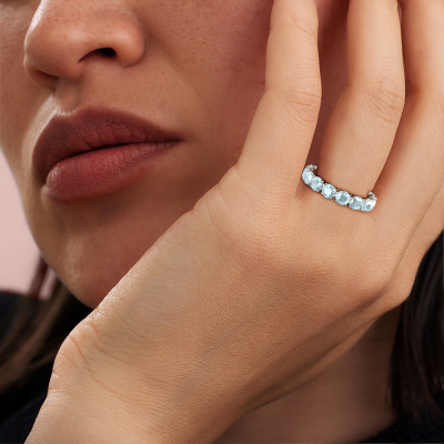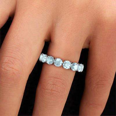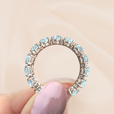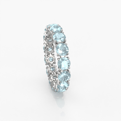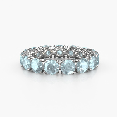 Deze ring heeft de naam Vivienne 4.2, dit type ring noemen we een eternity ring, hierbij worden volledig rondom de ring edelstenen gezet. Deze ring uitgevoerd in 14 Carat witgoud heeft allemaal kleine aquamarijn, 4.2 mm. Deze witgouden eternity ring is een prachtige, betekenisvolle ring om je aanzoek wel heel bijzonder te maken. De schitterende aquamarijn zijn allen identiek qua grootte en worden rondom de ring geplaatst. Alle aquamarijn worden zeer zorgvuldig geselecteerd, juist omdat ze zo identiek mogelijk moeten zijn om het beste resultaat te creëren op deze ring. Het zijn natuurproducten, waardoor er toch minuscule verschillen tussen de stenen kunnen zitten. Maar doordat alle aquamarijn door onze goudsmid met de hand heel nauwkeurig worden geplaatst, kan het eternity effect versterkt worden. Het vraagt veel geduld en een vaardige hand, maar het vervaardigen van de perfecte ring is de passie dat onze goudsmeden drijft. Het resultaat wordt een prachtige ring, waarin de aquamarijn eindeloos door lijken te lopen. Het symbool voor jouw oneindige liefde voor haar! Prachtig toch?Door het gebruik van de modernste technieken, gecombineerd met ambachtelijk vakmanschap kunnen wij alle ringen zelf in ons atelier maken. Iedere ring wordt pas gemaakt nadat deze besteld is. Dit heeft als bijkomend voordeel dat we kunnen leveren tegen een prijs die je nergens anders tegenkomt.