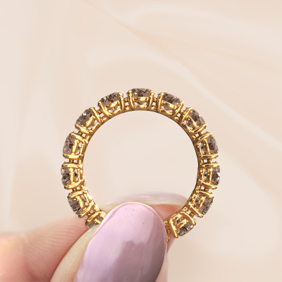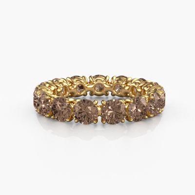 Deze ring heeft de naam Vivienne 4.2, dit type ring noemen we een eternity ring, hierbij worden volledig rondom de ring edelstenen gezet. Deze ring uitgevoerd in 14 Carat goud heeft allemaal kleine bruine diamanten, 0.30 crt. Deze gouden eternity ring is een prachtige, betekenisvolle ring om je aanzoek wel heel bijzonder te maken. De schitterende bruine diamanten zijn allen identiek qua grootte en worden rondom de ring geplaatst. Alle bruine diamanten worden zeer zorgvuldig geselecteerd, juist omdat ze zo identiek mogelijk moeten zijn om het beste resultaat te creëren op deze ring. Het zijn natuurproducten, waardoor er toch minuscule verschillen tussen de stenen kunnen zitten. Maar doordat alle bruine diamanten door onze goudsmid met de hand heel nauwkeurig worden geplaatst, kan het eternity effect versterkt worden. Het vraagt veel geduld en een vaardige hand, maar het vervaardigen van de perfecte ring is de passie dat onze goudsmeden drijft. Het resultaat wordt een prachtige ring, waarin de bruine diamanten eindeloos door lijken te lopen. Het symbool voor jouw oneindige liefde voor haar! Prachtig toch?Door het gebruik van de modernste technieken, gecombineerd met ambachtelijk vakmanschap kunnen wij alle ringen zelf in ons atelier maken. Iedere ring wordt pas gemaakt nadat deze besteld is. Dit heeft als bijkomend voordeel dat we kunnen leveren tegen een prijs die je nergens anders tegenkomt.