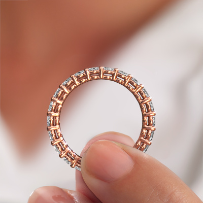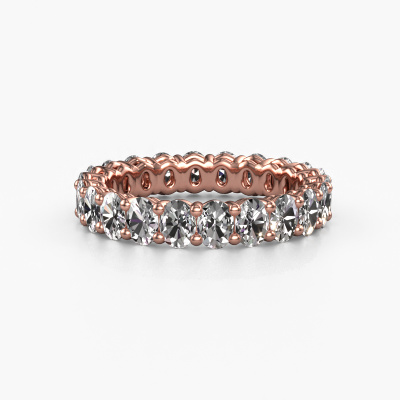 Deze aanschuifring heeft de naam Heddy OVL 3x4, dit type aanschuifring noemen we een eternity ring, hierbij worden volledig rondom de aanschuifring edelstenen gezet. Deze aanschuifring uitgevoerd in 14 Carat rosé goud heeft allemaal kleine diamanten, 0.15 crt. Deze rosé gouden eternity aanschuifring is een prachtige, betekenisvolle aanschuifring om je aanzoek wel heel bijzonder te maken. De schitterende diamanten zijn allen identiek qua grootte en worden rondom de aanschuifring geplaatst. Alle diamanten worden zeer zorgvuldig geselecteerd, juist omdat ze zo identiek mogelijk moeten zijn om het beste resultaat te creëren op deze ring. Het zijn natuurproducten, waardoor er toch minuscule verschillen tussen de stenen kunnen zitten. Maar doordat alle diamanten door onze goudsmid met de hand heel nauwkeurig worden geplaatst, kan het eternity effect versterkt worden. Het vraagt veel geduld en een vaardige hand, maar het vervaardigen van de perfecte aanschuifring is de passie dat onze goudsmeden drijft. Het resultaat wordt een prachtige ring, waarin de diamanten eindeloos door lijken te lopen. Het symbool voor jouw oneindige liefde voor haar! Prachtig toch?Onze goudsmeden vervaardigen pas je ring, zodra je deze besteld hebt. We hebben geen voorraden. Het voordeel hiervan is dat we de voorraad niet door hoeven te berekenen in de prijs, en wij daardoor sieraden kunnen leveren tegen een bijzonder lage prijs.