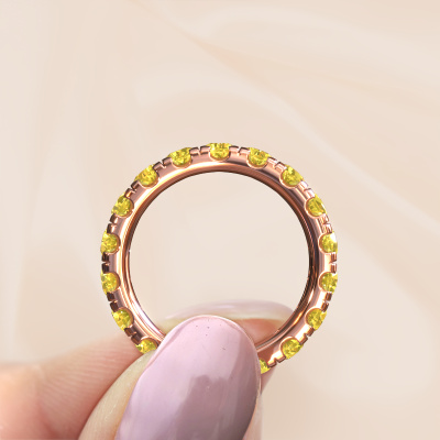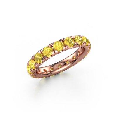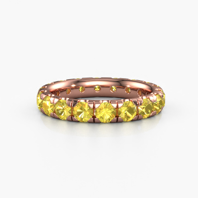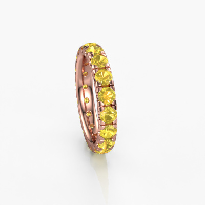 Deze aanschuifring heeft de naam Jackie 3.4, dit type aanschuifring noemen we een eternity ring, hierbij worden volledig rondom de aanschuifring edelstenen gezet. Deze aanschuifring uitgevoerd in 14 Carat rosé goud heeft allemaal kleine gele saffier, 3.4 mm. Deze rosé gouden eternity aanschuifring is een prachtige, betekenisvolle aanschuifring om je aanzoek wel heel bijzonder te maken. De schitterende gele saffier zijn allen identiek qua grootte en worden rondom de aanschuifring geplaatst. Alle gele saffier worden zeer zorgvuldig geselecteerd, juist omdat ze zo identiek mogelijk moeten zijn om het beste resultaat te creëren op deze ring. Het zijn natuurproducten, waardoor er toch minuscule verschillen tussen de stenen kunnen zitten. Maar doordat alle gele saffier door onze goudsmid met de hand heel nauwkeurig worden geplaatst, kan het eternity effect versterkt worden. Het vraagt veel geduld en een vaardige hand, maar het vervaardigen van de perfecte aanschuifring is de passie dat onze goudsmeden drijft. Het resultaat wordt een prachtige ring, waarin de gele saffier eindeloos door lijken te lopen. Het symbool voor jouw oneindige liefde voor haar! Prachtig toch?Met veel passie gaan onze edelsmeden met jouw ring aan de slag in ons atelier, zodra je deze besteld hebt. Doordat we geen sieraden op voorraad hebben, hoeven we de voorraad niet door te berekenen in de prijs. En dat zie je terug in de prijs! We geven je graag een beste prijsgarantie.Onze talentvolle ontwerpers voegen elke dag nieuwe designs toe aan de website, en werken samen om tot een zo gevarieerd mogelijke collectie te komen met de mooiste sieraden. Wil je een ring laten maken naar eigen ontwerp, neem dan eens contact met ons op voor een offerte. Graag doen wij je een aanbod, waarvan wij denken dat je wat betreft kwaliteit en prijs versteld zult staan.Om het voor jou makkelijker te maken kun je ieder besteld sieraad binnen 30 dagen na aflevering eenvoudig weer retour sturen.