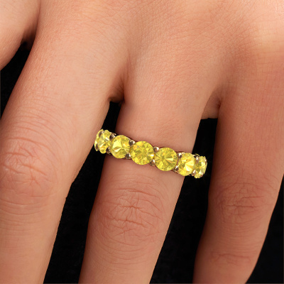 Deze ring heeft de naam Heddy rnd 4.7, dit type ring noemen we een eternity ring, hierbij worden volledig rondom de ring edelstenen gezet. Deze ring uitgevoerd in 14 Carat goud heeft allemaal kleine gele saffier, 4.7 mm. Deze gouden eternity ring is een prachtige, betekenisvolle ring om je aanzoek wel heel bijzonder te maken. De schitterende gele saffier zijn allen identiek qua grootte en worden rondom de ring geplaatst. Alle gele saffier worden zeer zorgvuldig geselecteerd, juist omdat ze zo identiek mogelijk moeten zijn om het beste resultaat te creëren op deze ring. Het zijn natuurproducten, waardoor er toch minuscule verschillen tussen de stenen kunnen zitten. Maar doordat alle gele saffier door onze goudsmid met de hand heel nauwkeurig worden geplaatst, kan het eternity effect versterkt worden. Het vraagt veel geduld en een vaardige hand, maar het vervaardigen van de perfecte ring is de passie dat onze goudsmeden drijft. Het resultaat wordt een prachtige ring, waarin de gele saffier eindeloos door lijken te lopen. Het symbool voor jouw oneindige liefde voor haar! Prachtig toch?Omdat wij zelf alle sieraden maken en direct aan jou leveren, kunnen wij je een ring leveren tegen een prijs die je nergens anders zult tegenkomen. Een ring wordt pas gemaakt als we een bestelling krijgen, hierdoor hebben wij geen dure voorraden en kunnen wij jou de beste prijs garanderen. Wij begrijpen dat het kopen van een sieraad online spannend is, en denken graag met je mee over de mogelijkheden binnen jouw budget.Elke dag worden nieuwe ring ontwerpen toegevoegd aan de site door ons team van talentvolle en gepassioneerde ontwerpers. Hierbij wordt ernaar gestreefd om een zo gevarieerd mogelijke collectie aan te bieden. Heb je bepaalde ideeën voor een ring, neem dan eens contact op voor een offerte. Wij doen je een aanbod wat betreft prijs en kwaliteit waar je geen nee tegen zult kunnen zeggen.Om het voor jou makkelijker te maken kun je ieder besteld sieraad binnen 30 dagen na aflevering eenvoudig weer retour sturen.