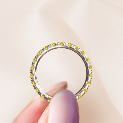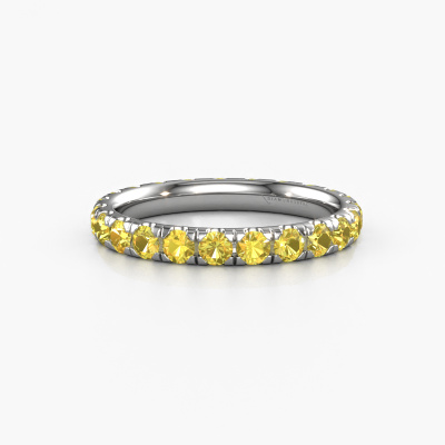 Deze ring heeft de naam Jackie 2.5, dit type ring noemen we een eternity ring, hierbij worden volledig rondom de ring edelstenen gezet. Deze ring uitgevoerd in platina heeft allemaal kleine gele saffier, 2.5 mm. Deze platina eternity ring is een prachtige, betekenisvolle ring om je aanzoek wel heel bijzonder te maken. De schitterende gele saffier zijn allen identiek qua grootte en worden rondom de ring geplaatst. Alle gele saffier worden zeer zorgvuldig geselecteerd, juist omdat ze zo identiek mogelijk moeten zijn om het beste resultaat te creëren op deze ring. Het zijn natuurproducten, waardoor er toch minuscule verschillen tussen de stenen kunnen zitten. Maar doordat alle gele saffier door onze goudsmid met de hand heel nauwkeurig worden geplaatst, kan het eternity effect versterkt worden. Het vraagt veel geduld en een vaardige hand, maar het vervaardigen van de perfecte ring is de passie dat onze goudsmeden drijft. Het resultaat wordt een prachtige ring, waarin de gele saffier eindeloos door lijken te lopen. Het symbool voor jouw oneindige liefde voor haar! Prachtig toch?Onze goudsmeden vervaardigen pas je ring, zodra je deze besteld hebt. We hebben geen voorraden. Het voordeel hiervan is dat we de voorraad niet door hoeven te berekenen in de prijs, en wij daardoor sieraden kunnen leveren tegen een bijzonder lage prijs.Iedere dag worden nieuwe sieraad ontwerpen toegevoegd aan de website. Ons team van gepassioneerde designers streeft ernaar om tot de mooiste ontwerpen te komen, en een zo gevarieerd mogelijk aanbod. Heb je ergens een ring gezien welke je wilt laten maken, stuur ons dan bericht. Wij sturen je graag een offerte toe. Hierin bieden wij de beste prijs en kwaliteit. Je zult dit zeker niet kunnen afslaan!Om het voor jou makkelijker te maken kun je ieder besteld sieraad binnen 30 dagen na aflevering eenvoudig weer retour sturen.