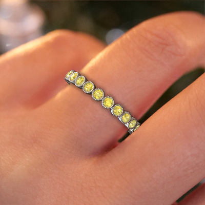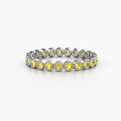 Deze ring heeft de naam Mariam 0.03, dit type ring noemen we een eternity ring, hierbij worden volledig rondom de ring edelstenen gezet. Deze ring uitgevoerd in 14 Carat witgoud heeft allemaal kleine gele saffier, 2 mm. Deze witgouden eternity ring is een prachtige, betekenisvolle ring om je aanzoek wel heel bijzonder te maken. De schitterende gele saffier zijn allen identiek qua grootte en worden rondom de ring geplaatst. Alle gele saffier worden zeer zorgvuldig geselecteerd, juist omdat ze zo identiek mogelijk moeten zijn om het beste resultaat te creëren op deze ring. Het zijn natuurproducten, waardoor er toch minuscule verschillen tussen de stenen kunnen zitten. Maar doordat alle gele saffier door onze goudsmid met de hand heel nauwkeurig worden geplaatst, kan het eternity effect versterkt worden. Het vraagt veel geduld en een vaardige hand, maar het vervaardigen van de perfecte ring is de passie dat onze goudsmeden drijft. Het resultaat wordt een prachtige ring, waarin de gele saffier eindeloos door lijken te lopen. Het symbool voor jouw oneindige liefde voor haar! Prachtig toch?Omdat wij zelf alle sieraden maken en direct aan jou leveren, kunnen wij je een ring leveren tegen een prijs die je nergens anders zult tegenkomen. Een ring wordt pas gemaakt als we een bestelling krijgen, hierdoor hebben wij geen dure voorraden en kunnen wij jou de beste prijs garanderen. Wij begrijpen dat het kopen van een sieraad online spannend is, en denken graag met je mee over de mogelijkheden binnen jouw budget.Elke dag worden nieuwe ring ontwerpen toegevoegd aan de site door ons team van talentvolle en gepassioneerde ontwerpers. Hierbij wordt ernaar gestreefd om een zo gevarieerd mogelijke collectie aan te bieden. Heb je bepaalde ideeën voor een ring, neem dan eens contact op voor een offerte. Wij doen je een aanbod wat betreft prijs en kwaliteit waar je geen nee tegen zult kunnen zeggen.Om het voor jou makkelijker te maken kun je ieder besteld sieraad binnen 30 dagen na aflevering eenvoudig weer retour sturen.