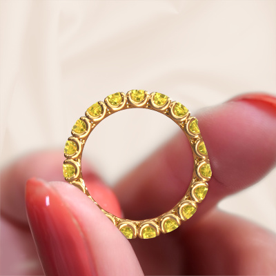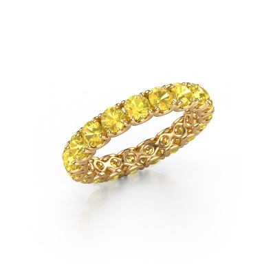 Deze aanschuifring heeft de naam Estee 3.4, dit type aanschuifring noemen we een eternity ring, hierbij worden volledig rondom de aanschuifring edelstenen gezet. Deze aanschuifring uitgevoerd in 14 Carat goud heeft allemaal kleine gele saffier van 3.4 mm. De schitterende gele saffier zijn allen identiek qua grootte en worden rondom in de band van de aanschuifring geplaatst. Alle gele saffier worden zeer zorgvuldig geselecteerd, juist omdat ze zo identiek mogelijk moeten zijn om het beste resultaat te creëren op deze ring. Onze goudsmid plaatst alle gele saffier heel precies met de hand worden geplaatst, en daardoor kan het eternity effect versterkt worden. Dit is de passie die onze goudsmeden drijft: het creëren van de perfecte ring. Dat is het mooie van ons ambacht! Het resultaat is een prachtige moderne gouden ring, waarin de gele saffier eindeloos door lijken te lopen. Het perfecte symbool voor jouw oneindige liefde voor haar! Hoe bijzonder is dat!Door het gebruik van de modernste technieken, gecombineerd met ambachtelijk vakmanschap kunnen wij alle ringen zelf in ons atelier maken. Iedere ring wordt pas gemaakt nadat deze besteld is. Dit heeft als bijkomend voordeel dat we kunnen leveren tegen een prijs die je nergens anders tegenkomt.