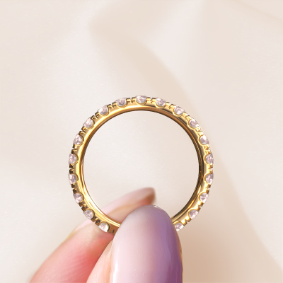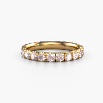 Deze aanschuifring heeft de naam Jackie 2.7, dit type aanschuifring noemen we een eternity ring, hierbij worden volledig rondom de aanschuifring edelstenen gezet. Deze aanschuifring uitgevoerd in 14 Carat goud heeft allemaal kleine morganiet champagne van 2.7 mm. De schitterende morganiet champagne zijn allen identiek qua grootte en worden rondom in de band van de aanschuifring geplaatst. Alle morganiet champagne worden zeer zorgvuldig geselecteerd, juist omdat ze zo identiek mogelijk moeten zijn om het beste resultaat te creëren op deze ring. Onze goudsmid plaatst alle morganiet champagne heel precies met de hand worden geplaatst, en daardoor kan het eternity effect versterkt worden. Dit is de passie die onze goudsmeden drijft: het creëren van de perfecte ring. Dat is het mooie van ons ambacht! Het resultaat is een prachtige eigentijdse gouden ring, waarin de morganiet champagne eindeloos door lijken te lopen. Het perfecte symbool voor jouw oneindige liefde voor haar! Hoe bijzonder is dat!