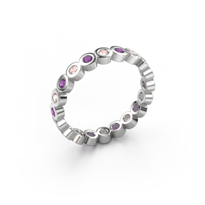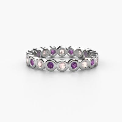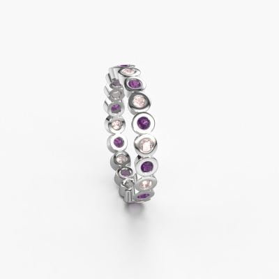 Deze aanschuifring heeft de naam Edwina 1, dit type aanschuifring noemen we een eternity ring, hierbij worden volledig rondom de aanschuifring edelstenen gezet. Deze aanschuifring uitgevoerd in 14 Carat witgoud heeft allemaal kleine morganiet champagne, 2 mm. Deze witgouden eternity aanschuifring is een prachtige, betekenisvolle aanschuifring om je aanzoek wel heel bijzonder te maken. De schitterende morganiet champagne zijn allen identiek qua grootte en worden rondom de aanschuifring geplaatst. Alle morganiet champagne worden zeer zorgvuldig geselecteerd, juist omdat ze zo identiek mogelijk moeten zijn om het beste resultaat te creëren op deze ring. Het zijn natuurproducten, waardoor er toch minuscule verschillen tussen de stenen kunnen zitten. Maar doordat alle morganiet champagne door onze goudsmid met de hand heel nauwkeurig worden geplaatst, kan het [sortr_plural] effect versterkt worden. Het vraagt veel geduld en een vaardige hand, maar het vervaardigen van de perfecte aanschuifring is de passie dat onze goudsmeden drijft. Het resultaat wordt een prachtige ring, waarin de morganiet champagne eindeloos door lijken te lopen. Het symbool voor jouw oneindige liefde voor haar! Prachtig toch?