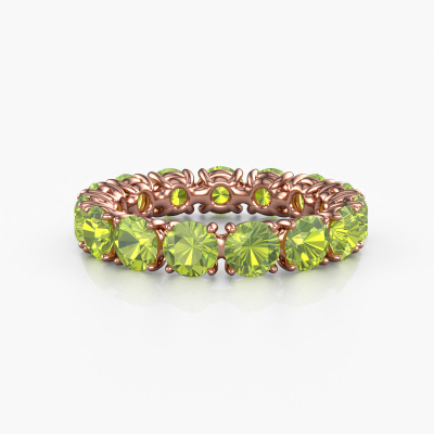 Deze ring heeft de naam Vivienne 4.2, dit type ring noemen we een eternity ring, hierbij worden volledig rondom de ring edelstenen gezet. Deze ring uitgevoerd in 14 Carat rosé goud heeft allemaal kleine peridoot, 4.2 mm. Deze rosé gouden eternity ring is een prachtige, betekenisvolle ring om je aanzoek wel heel bijzonder te maken. De schitterende peridoot zijn allen identiek qua grootte en worden rondom de ring geplaatst. Alle peridoot worden zeer zorgvuldig geselecteerd, juist omdat ze zo identiek mogelijk moeten zijn om het beste resultaat te creëren op deze ring. Het zijn natuurproducten, waardoor er toch minuscule verschillen tussen de stenen kunnen zitten. Maar doordat alle peridoot door onze goudsmid met de hand heel nauwkeurig worden geplaatst, kan het eternity effect versterkt worden. Het vraagt veel geduld en een vaardige hand, maar het vervaardigen van de perfecte ring is de passie dat onze goudsmeden drijft. Het resultaat wordt een prachtige ring, waarin de peridoot eindeloos door lijken te lopen. Het symbool voor jouw oneindige liefde voor haar! Prachtig toch?Door het gebruik van de modernste technieken, gecombineerd met ambachtelijk vakmanschap kunnen wij alle ringen zelf in ons atelier maken. Iedere ring wordt pas gemaakt nadat deze besteld is. Dit heeft als bijkomend voordeel dat we kunnen leveren tegen een prijs die je nergens anders tegenkomt.