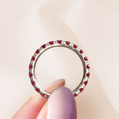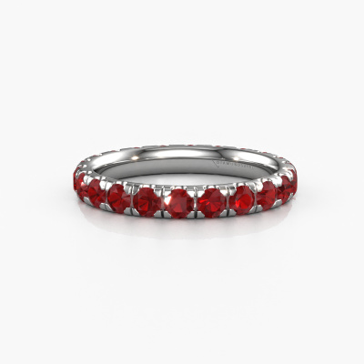 Deze aanschuifring heeft de naam Jackie 2.7, dit type aanschuifring noemen we een eternity ring, hierbij worden volledig rondom de aanschuifring edelstenen gezet. Deze aanschuifring uitgevoerd in platina heeft allemaal kleine robijn van 2.7 mm. De schitterende robijn zijn allen identiek qua grootte en worden rondom in de band van de aanschuifring geplaatst. Alle robijn worden zeer zorgvuldig geselecteerd, juist omdat ze zo identiek mogelijk moeten zijn om het beste resultaat te creëren op deze ring. Onze goudsmid plaatst alle robijn heel precies met de hand worden geplaatst, en daardoor kan het eternity effect versterkt worden. Dit is de passie die onze goudsmeden drijft: het creëren van de perfecte ring. Dat is het mooie van ons ambacht! Het resultaat is een prachtige moderne platina ring, waarin de robijn eindeloos door lijken te lopen. Het perfecte symbool voor jouw oneindige liefde voor haar! Hoe bijzonder is dat!Omdat wij zelf alle sieraden maken en direct aan jou leveren, kunnen wij je een ring leveren tegen een prijs die je nergens anders zult tegenkomen. Een ring wordt pas gemaakt als we een bestelling krijgen, hierdoor hebben wij geen dure voorraden en kunnen wij jou de beste prijs garanderen. Wij begrijpen dat het kopen van een sieraad online spannend is, en denken graag met je mee over de mogelijkheden binnen jouw budget.Elke dag worden nieuwe ring ontwerpen toegevoegd aan de site door ons team van talentvolle en gepassioneerde ontwerpers. Hierbij wordt ernaar gestreefd om een zo gevarieerd mogelijke collectie aan te bieden. Heb je bepaalde ideeën voor een ring, neem dan eens contact op voor een offerte. Wij doen je een aanbod wat betreft prijs en kwaliteit waar je geen nee tegen zult kunnen zeggen.Om het voor jou makkelijker te maken kun je ieder besteld sieraad binnen 30 dagen na aflevering eenvoudig weer retour sturen.