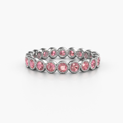 Deze ring heeft de naam Mariam 0.05, dit type ring noemen we een eternity ring, hierbij worden volledig rondom de ring edelstenen gezet. Deze ring uitgevoerd in platina heeft allemaal kleine tourmalijn pink van 2.4 mm. De schitterende tourmalijn pink zijn allen identiek qua grootte en worden rondom in de band van de ring geplaatst. Alle tourmalijn pink worden zeer zorgvuldig geselecteerd, juist omdat ze zo identiek mogelijk moeten zijn om het beste resultaat te creëren op deze ring. Onze goudsmid plaatst alle tourmalijn pink heel precies met de hand worden geplaatst, en daardoor kan het eternity effect versterkt worden. Dit is de passie die onze goudsmeden drijft: het creëren van de perfecte ring. Dat is het mooie van ons ambacht! Het resultaat is een prachtige moderne platina ring, waarin de tourmalijn pink eindeloos door lijken te lopen. Het perfecte symbool voor jouw oneindige liefde voor haar! Hoe bijzonder is dat!Door het gebruik van de modernste technieken, gecombineerd met ambachtelijk vakmanschap kunnen wij alle ringen zelf in ons atelier maken. Iedere ring wordt pas gemaakt nadat deze besteld is. Dit heeft als bijkomend voordeel dat we kunnen leveren tegen een prijs die je nergens anders tegenkomt.