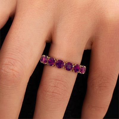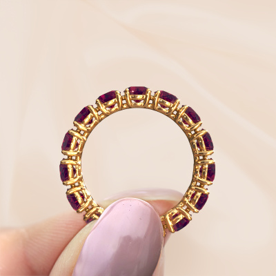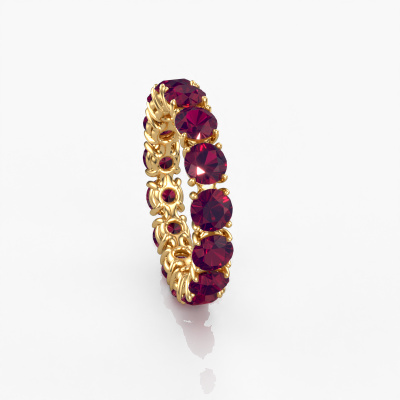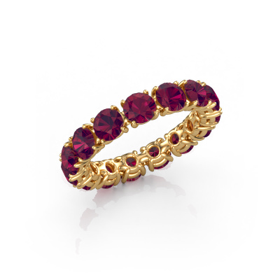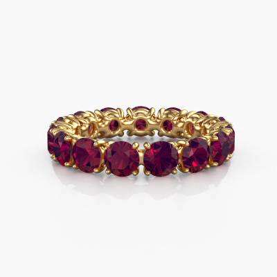 Deze ring heeft de naam Vivienne 4.2, dit type ring noemen we een eternity ring, hierbij worden volledig rondom de ring edelstenen gezet. Deze ring uitgevoerd in 14 Carat goud heeft allemaal kleine rhodoliet, 4.2 mm. Deze gouden eternity ring is een prachtige, betekenisvolle ring om je aanzoek wel heel bijzonder te maken. De schitterende rhodoliet zijn allen identiek qua grootte en worden rondom de ring geplaatst. Alle rhodoliet worden zeer zorgvuldig geselecteerd, juist omdat ze zo identiek mogelijk moeten zijn om het beste resultaat te creëren op deze ring. Het zijn natuurproducten, waardoor er toch minuscule verschillen tussen de stenen kunnen zitten. Maar doordat alle rhodoliet door onze goudsmid met de hand heel nauwkeurig worden geplaatst, kan het eternity effect versterkt worden. Het vraagt veel geduld en een vaardige hand, maar het vervaardigen van de perfecte ring is de passie dat onze goudsmeden drijft. Het resultaat wordt een prachtige ring, waarin de rhodoliet eindeloos door lijken te lopen. Het symbool voor jouw oneindige liefde voor haar! Prachtig toch?Door het gebruik van de modernste technieken, gecombineerd met ambachtelijk vakmanschap kunnen wij alle ringen zelf in ons atelier maken. Iedere ring wordt pas gemaakt nadat deze besteld is. Dit heeft als bijkomend voordeel dat we kunnen leveren tegen een prijs die je nergens anders tegenkomt.