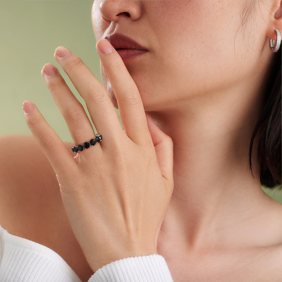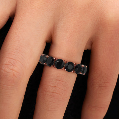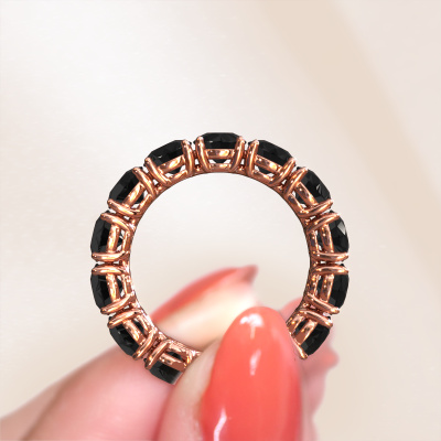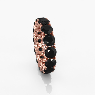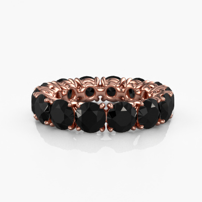 Deze ring heeft de naam Vivienne 5.0, dit type ring noemen we een eternity ring, hierbij worden volledig rondom de ring edelstenen gezet. Deze ring uitgevoerd in 14 Carat rosé goud heeft allemaal kleine zwarte diamanten van 8.40 crt. De schitterende zwarte diamanten zijn allen identiek qua grootte en worden rondom in de band van de ring geplaatst. Alle zwarte diamanten worden zeer zorgvuldig geselecteerd, juist omdat ze zo identiek mogelijk moeten zijn om het beste resultaat te creëren op deze ring. Onze goudsmid plaatst alle zwarte diamanten heel precies met de hand worden geplaatst, en daardoor kan het eternity effect versterkt worden. Dit is de passie die onze goudsmeden drijft: het creëren van de perfecte ring. Dat is het mooie van ons ambacht! Het resultaat is een prachtige exclusieve rosé gouden ring, waarin de zwarte diamanten eindeloos door lijken te lopen. Het perfecte symbool voor jouw oneindige liefde voor haar! Hoe bijzonder is dat!Door onze modernste technieken kunnen wij met uiterste precisie prachtige sieraden te ontwerpen en voor jou personaliseren in de hoogste juwelierskwaliteit. Tegelijkertijd zijn onze ringen altijd 30% goedkoper dan bij een andere juwelier. Dit komt doordat alle ringen pas vervaardigd worden op het moment dat deze besteld wordt en we daardoor geen dure voorraden hoeven te hanteren. Mocht je aan een bepaald budget gebonden zijn, kunnen we je graag adviseren welke combinatie je het beste kunt kiezen.Iedere dag worden nieuwe sieraad ontwerpen toegevoegd aan de website. Ons team van gepassioneerde designers streeft ernaar om tot de mooiste ontwerpen te komen, en een zo gevarieerd mogelijk aanbod. Heb je ergens een ring gezien welke je wilt laten maken, stuur ons dan bericht. Wij sturen je graag een offerte toe. Hierin bieden wij de beste prijs en kwaliteit. Je zult dit zeker niet kunnen afslaan!Om het voor jou makkelijker te maken kun je ieder besteld sieraad binnen 30 dagen na aflevering eenvoudig weer retour sturen.