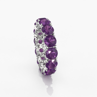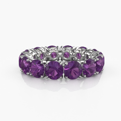 Deze ring heeft de naam Vivienne 5.0, dit type ring noemen we een eternity ring, hierbij worden volledig rondom de ring edelstenen gezet. Deze ring uitgevoerd in 14 Carat witgoud heeft allemaal kleine amethisten van 5 mm. De schitterende amethisten zijn allen identiek qua grootte en worden rondom in de band van de ring geplaatst. Alle amethisten worden zeer zorgvuldig geselecteerd, juist omdat ze zo identiek mogelijk moeten zijn om het beste resultaat te creëren op deze ring. Onze goudsmid plaatst alle amethisten heel precies met de hand worden geplaatst, en daardoor kan het eternity effect versterkt worden. Dit is de passie die onze goudsmeden drijft: het creëren van de perfecte ring. Dat is het mooie van ons ambacht! Het resultaat is een prachtige exclusieve witgouden ring, waarin de amethisten eindeloos door lijken te lopen. Het perfecte symbool voor jouw oneindige liefde voor haar! Hoe bijzonder is dat!Door onze modernste technieken kunnen wij met uiterste precisie prachtige sieraden te ontwerpen en voor jou personaliseren in de hoogste juwelierskwaliteit. Tegelijkertijd zijn onze ringen altijd 30% goedkoper dan bij een andere juwelier. Dit komt doordat alle ringen pas vervaardigd worden op het moment dat deze besteld wordt en we daardoor geen dure voorraden hoeven te hanteren. Mocht je aan een bepaald budget gebonden zijn, kunnen we je graag adviseren welke combinatie je het beste kunt kiezen.Iedere dag worden nieuwe sieraad ontwerpen toegevoegd aan de website. Ons team van gepassioneerde designers streeft ernaar om tot de mooiste ontwerpen te komen, en een zo gevarieerd mogelijk aanbod. Heb je ergens een ring gezien welke je wilt laten maken, stuur ons dan bericht. Wij sturen je graag een offerte toe. Hierin bieden wij de beste prijs en kwaliteit. Je zult dit zeker niet kunnen afslaan!Om het voor jou makkelijker te maken kun je ieder besteld sieraad binnen 30 dagen na aflevering eenvoudig weer retour sturen.