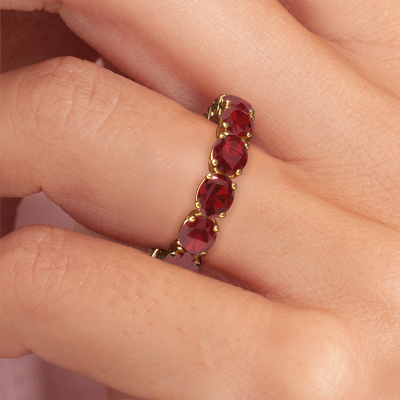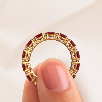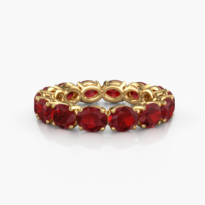 Deze ring heeft de naam Vivienne OVL 5x4, dit type ring noemen we een eternity ring, hierbij worden volledig rondom de ring edelstenen gezet. Deze ring uitgevoerd in 14 Carat goud heeft allemaal kleine robijn, 5x4 mm. Deze gouden eternity ring is een prachtige, betekenisvolle ring om je aanzoek wel heel bijzonder te maken. De schitterende robijn zijn allen identiek qua grootte en worden rondom de ring geplaatst. Alle robijn worden zeer zorgvuldig geselecteerd, juist omdat ze zo identiek mogelijk moeten zijn om het beste resultaat te creëren op deze ring. Het zijn natuurproducten, waardoor er toch minuscule verschillen tussen de stenen kunnen zitten. Maar doordat alle robijn door onze goudsmid met de hand heel nauwkeurig worden geplaatst, kan het eternity effect versterkt worden. Het vraagt veel geduld en een vaardige hand, maar het vervaardigen van de perfecte ring is de passie dat onze goudsmeden drijft. Het resultaat wordt een prachtige ring, waarin de robijn eindeloos door lijken te lopen. Het symbool voor jouw oneindige liefde voor haar! Prachtig toch?Door onze modernste technieken kunnen wij met uiterste precisie prachtige sieraden te ontwerpen en voor jou personaliseren in de hoogste juwelierskwaliteit. Tegelijkertijd zijn onze ringen altijd 30% goedkoper dan bij een andere juwelier. Dit komt doordat alle ringen pas vervaardigd worden op het moment dat deze besteld wordt en we daardoor geen dure voorraden hoeven te hanteren. Mocht je aan een bepaald budget gebonden zijn, kunnen we je graag adviseren welke combinatie je het beste kunt kiezen.Iedere dag worden nieuwe sieraad ontwerpen toegevoegd aan de website. Ons team van gepassioneerde designers streeft ernaar om tot de mooiste ontwerpen te komen, en een zo gevarieerd mogelijk aanbod. Heb je ergens een ring gezien welke je wilt laten maken, stuur ons dan bericht. Wij sturen je graag een offerte toe. Hierin bieden wij de beste prijs en kwaliteit. Je zult dit zeker niet kunnen afslaan!Om het voor jou makkelijker te maken kun je ieder besteld sieraad binnen 30 dagen na aflevering eenvoudig weer retour sturen.