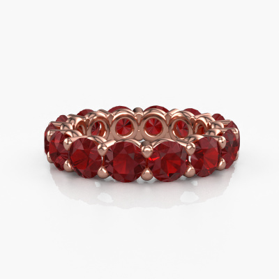 Deze ring heeft de naam Heddy rnd 4.7, dit type ring noemen we een eternity ring, hierbij worden volledig rondom de ring edelstenen gezet. Deze ring uitgevoerd in 14 Carat rosé goud heeft allemaal kleine robijn, 4.7 mm. Deze rosé gouden eternity ring is een prachtige, betekenisvolle ring om je aanzoek wel heel bijzonder te maken. De schitterende robijn zijn allen identiek qua grootte en worden rondom de ring geplaatst. Alle robijn worden zeer zorgvuldig geselecteerd, juist omdat ze zo identiek mogelijk moeten zijn om het beste resultaat te creëren op deze ring. Het zijn natuurproducten, waardoor er toch minuscule verschillen tussen de stenen kunnen zitten. Maar doordat alle robijn door onze goudsmid met de hand heel nauwkeurig worden geplaatst, kan het eternity effect versterkt worden. Het vraagt veel geduld en een vaardige hand, maar het vervaardigen van de perfecte ring is de passie dat onze goudsmeden drijft. Het resultaat wordt een prachtige ring, waarin de robijn eindeloos door lijken te lopen. Het symbool voor jouw oneindige liefde voor haar! Prachtig toch?Omdat wij zelf alle sieraden maken en direct aan jou leveren, kunnen wij je een ring leveren tegen een prijs die je nergens anders zult tegenkomen. Een ring wordt pas gemaakt als we een bestelling krijgen, hierdoor hebben wij geen dure voorraden en kunnen wij jou de beste prijs garanderen. Wij begrijpen dat het kopen van een sieraad online spannend is, en denken graag met je mee over de mogelijkheden binnen jouw budget.Elke dag worden nieuwe ring ontwerpen toegevoegd aan de site door ons team van talentvolle en gepassioneerde ontwerpers. Hierbij wordt ernaar gestreefd om een zo gevarieerd mogelijke collectie aan te bieden. Heb je bepaalde ideeën voor een ring, neem dan eens contact op voor een offerte. Wij doen je een aanbod wat betreft prijs en kwaliteit waar je geen nee tegen zult kunnen zeggen.Om het voor jou makkelijker te maken kun je ieder besteld sieraad binnen 30 dagen na aflevering eenvoudig weer retour sturen.