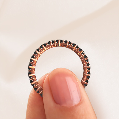 Deze aanschuifring heeft de naam Janie 2.7mm, dit type aanschuifring noemen we een eternity ring, hierbij worden volledig rondom de aanschuifring edelstenen gezet. Deze aanschuifring uitgevoerd in 14 Carat rosé goud heeft allemaal kleine zwarte diamanten van 2.112 crt. De schitterende zwarte diamanten zijn allen identiek qua grootte en worden rondom in de band van de aanschuifring geplaatst. Alle zwarte diamanten worden zeer zorgvuldig geselecteerd, juist omdat ze zo identiek mogelijk moeten zijn om het beste resultaat te creëren op deze ring. Onze goudsmid plaatst alle zwarte diamanten heel precies met de hand worden geplaatst, en daardoor kan het eternity effect versterkt worden. Dit is de passie die onze goudsmeden drijft: het creëren van de perfecte ring. Dat is het mooie van ons ambacht! Het resultaat is een prachtige trendy rosé gouden ring, waarin de zwarte diamanten eindeloos door lijken te lopen. Het perfecte symbool voor jouw oneindige liefde voor haar! Hoe bijzonder is dat!Door het gebruik van de modernste technieken, gecombineerd met ambachtelijk vakmanschap kunnen wij alle ringen zelf in ons atelier maken. Iedere ring wordt pas gemaakt nadat deze besteld is. Dit heeft als bijkomend voordeel dat we kunnen leveren tegen een prijs die je nergens anders tegenkomt.