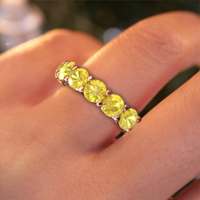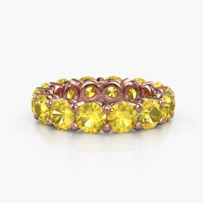 Deze ring heeft de naam Heddy rnd 5.0, dit type ring noemen we een eternity ring, hierbij worden volledig rondom de ring edelstenen gezet. Deze ring uitgevoerd in 14 Carat rosé goud heeft allemaal kleine gele saffier van 5 mm. De schitterende gele saffier zijn allen identiek qua grootte en worden rondom in de band van de ring geplaatst. Alle gele saffier worden zeer zorgvuldig geselecteerd, juist omdat ze zo identiek mogelijk moeten zijn om het beste resultaat te creëren op deze ring. Onze goudsmid plaatst alle gele saffier heel precies met de hand worden geplaatst, en daardoor kan het eternity effect versterkt worden. Dit is de passie die onze goudsmeden drijft: het creëren van de perfecte ring. Dat is het mooie van ons ambacht! Het resultaat is een prachtige exclusieve rosé gouden ring, waarin de gele saffier eindeloos door lijken te lopen. Het perfecte symbool voor jouw oneindige liefde voor haar! Hoe bijzonder is dat!Door het gebruik van de modernste technieken, gecombineerd met ambachtelijk vakmanschap kunnen wij alle ringen zelf in ons atelier maken. Iedere ring wordt pas gemaakt nadat deze besteld is. Dit heeft als bijkomend voordeel dat we kunnen leveren tegen een prijs die je nergens anders tegenkomt.