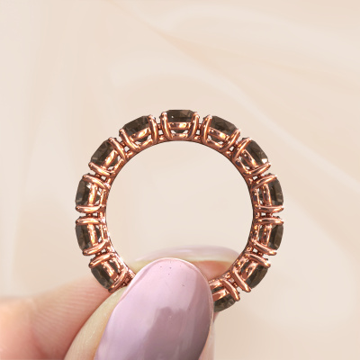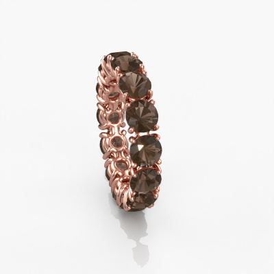 Deze ring heeft de naam Vivienne 4.7, dit type ring noemen we een eternity ring, hierbij worden volledig rondom de ring edelstenen gezet. Deze ring uitgevoerd in 14 Carat rosé goud heeft allemaal kleine rookkwarts van 4.7 mm. De schitterende rookkwarts zijn allen identiek qua grootte en worden rondom in de band van de ring geplaatst. Alle rookkwarts worden zeer zorgvuldig geselecteerd, juist omdat ze zo identiek mogelijk moeten zijn om het beste resultaat te creëren op deze ring. Onze goudsmid plaatst alle rookkwarts heel precies met de hand worden geplaatst, en daardoor kan het eternity effect versterkt worden. Dit is de passie die onze goudsmeden drijft: het creëren van de perfecte ring. Dat is het mooie van ons ambacht! Het resultaat is een prachtige exclusieve rosé gouden ring, waarin de rookkwarts eindeloos door lijken te lopen. Het perfecte symbool voor jouw oneindige liefde voor haar! Hoe bijzonder is dat!Met veel passie gaan onze edelsmeden met jouw ring aan de slag in ons atelier, zodra je deze besteld hebt. Doordat we geen sieraden op voorraad hebben, hoeven we de voorraad niet door te berekenen in de prijs. En dat zie je terug in de prijs! We geven je graag een beste prijsgarantie.Onze talentvolle ontwerpers voegen elke dag nieuwe designs toe aan de website, en werken samen om tot een zo gevarieerd mogelijke collectie te komen met de mooiste sieraden. Wil je een ring laten maken naar eigen ontwerp, neem dan eens contact met ons op voor een offerte. Graag doen wij je een aanbod, waarvan wij denken dat je wat betreft kwaliteit en prijs versteld zult staan.Om het voor jou makkelijker te maken kun je ieder besteld sieraad binnen 30 dagen na aflevering eenvoudig weer retour sturen.