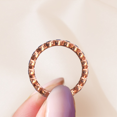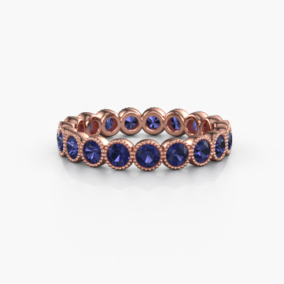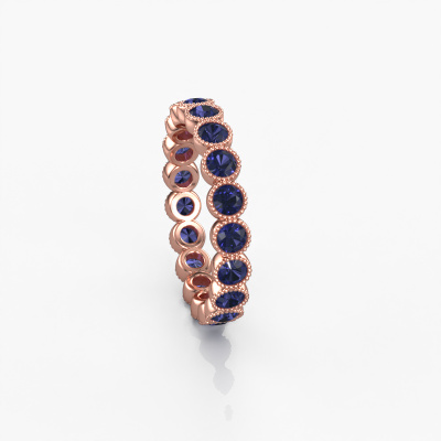 Deze ring heeft de naam Mariam 0.07, dit type ring noemen we een eternity ring, hierbij worden volledig rondom de ring edelstenen gezet. Deze ring uitgevoerd in 14 Carat rosé goud heeft allemaal kleine saffier van 2.7 mm. De schitterende saffier zijn allen identiek qua grootte en worden rondom in de band van de ring geplaatst. Alle saffier worden zeer zorgvuldig geselecteerd, juist omdat ze zo identiek mogelijk moeten zijn om het beste resultaat te creëren op deze ring. Onze goudsmid plaatst alle saffier heel precies met de hand worden geplaatst, en daardoor kan het eternity effect versterkt worden. Dit is de passie die onze goudsmeden drijft: het creëren van de perfecte ring. Dat is het mooie van ons ambacht! Het resultaat is een prachtige trendy rosé gouden ring, waarin de saffier eindeloos door lijken te lopen. Het perfecte symbool voor jouw oneindige liefde voor haar! Hoe bijzonder is dat!Met veel passie gaan onze edelsmeden met jouw ring aan de slag in ons atelier, zodra je deze besteld hebt. Doordat we geen sieraden op voorraad hebben, hoeven we de voorraad niet door te berekenen in de prijs. En dat zie je terug in de prijs! We geven je graag een beste prijsgarantie.Onze talentvolle ontwerpers voegen elke dag nieuwe designs toe aan de website, en werken samen om tot een zo gevarieerd mogelijke collectie te komen met de mooiste sieraden. Wil je een ring laten maken naar eigen ontwerp, neem dan eens contact met ons op voor een offerte. Graag doen wij je een aanbod, waarvan wij denken dat je wat betreft kwaliteit en prijs versteld zult staan.Om het voor jou makkelijker te maken kun je ieder besteld sieraad binnen 30 dagen na aflevering eenvoudig weer retour sturen.