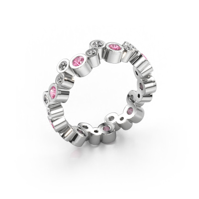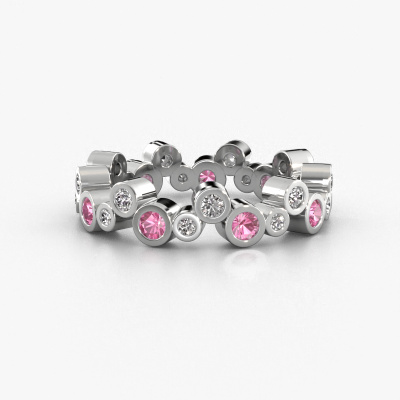 Deze ring heeft de naam Tessa, dit type ring noemen we een eternity ring, hierbij worden volledig rondom de ring edelstenen gezet. Deze ring uitgevoerd in 14 Carat witgoud heeft allemaal kleine roze saffier, 2.5 mm. Deze witgouden eternity ring is een prachtige, betekenisvolle ring om je aanzoek wel heel bijzonder te maken. De schitterende roze saffier zijn allen identiek qua grootte en worden rondom de ring geplaatst. Alle roze saffier worden zeer zorgvuldig geselecteerd, juist omdat ze zo identiek mogelijk moeten zijn om het beste resultaat te creëren op deze ring. Het zijn natuurproducten, waardoor er toch minuscule verschillen tussen de stenen kunnen zitten. Maar doordat alle roze saffier door onze goudsmid met de hand heel nauwkeurig worden geplaatst, kan het gedurfde effect versterkt worden. Het vraagt veel geduld en een vaardige hand, maar het vervaardigen van de perfecte ring is de passie dat onze goudsmeden drijft. Het resultaat wordt een prachtige ring, waarin de roze saffier eindeloos door lijken te lopen. Het symbool voor jouw oneindige liefde voor haar! Prachtig toch?Door onze modernste technieken kunnen wij met uiterste precisie prachtige sieraden te ontwerpen en voor jou personaliseren in de hoogste juwelierskwaliteit. Tegelijkertijd zijn onze ringen altijd 30% goedkoper dan bij een andere juwelier. Dit komt doordat alle ringen pas vervaardigd worden op het moment dat deze besteld wordt en we daardoor geen dure voorraden hoeven te hanteren. Mocht je aan een bepaald budget gebonden zijn, kunnen we je graag adviseren welke combinatie je het beste kunt kiezen.Onze talentvolle ontwerpers voegen elke dag nieuwe designs toe aan de website, en werken samen om tot een zo gevarieerd mogelijke collectie te komen met de mooiste sieraden. Wil je een ring laten maken naar eigen ontwerp, neem dan eens contact met ons op voor een offerte. Graag doen wij je een aanbod, waarvan wij denken dat je wat betreft kwaliteit en prijs versteld zult staan.Om het voor jou makkelijker te maken kun je ieder besteld sieraad binnen 30 dagen na aflevering eenvoudig weer retour sturen.