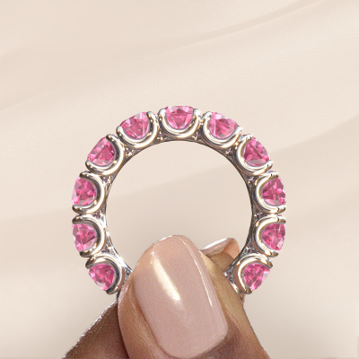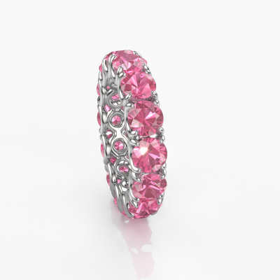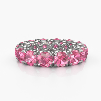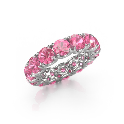 Deze ring heeft de naam Estee 5.0, dit type ring noemen we een eternity ring, hierbij worden volledig rondom de ring edelstenen gezet. Deze ring uitgevoerd in 14 Carat witgoud heeft allemaal kleine roze saffier van 5 mm. De schitterende roze saffier zijn allen identiek qua grootte en worden rondom in de band van de ring geplaatst. Alle roze saffier worden zeer zorgvuldig geselecteerd, juist omdat ze zo identiek mogelijk moeten zijn om het beste resultaat te creëren op deze ring. Onze goudsmid plaatst alle roze saffier heel precies met de hand worden geplaatst, en daardoor kan het eternity effect versterkt worden. Dit is de passie die onze goudsmeden drijft: het creëren van de perfecte ring. Dat is het mooie van ons ambacht! Het resultaat is een prachtige exclusieve witgouden ring, waarin de roze saffier eindeloos door lijken te lopen. Het perfecte symbool voor jouw oneindige liefde voor haar! Hoe bijzonder is dat!Ben je gebonden aan een bepaald budget? Neem gerust contact met ons op, we adviseren graag over alle mogelijkheden. Sowieso leveren wij alle ringen tegen een prijs die je nergens anders tegen komt, doordat we de ring pas vervaardigen wanneer je deze besteld. Hierdoor kunnen wij je een beste prijs garantie geven.Onze talentvolle ontwerpers voegen elke dag nieuwe designs toe aan de website, en werken samen om tot een zo gevarieerd mogelijke collectie te komen met de mooiste sieraden. Wil je een ring laten maken naar eigen ontwerp, neem dan eens contact met ons op voor een offerte. Graag doen wij je een aanbod, waarvan wij denken dat je wat betreft kwaliteit en prijs versteld zult staan.Om het voor jou makkelijker te maken kun je ieder besteld sieraad binnen 30 dagen na aflevering eenvoudig weer retour sturen.