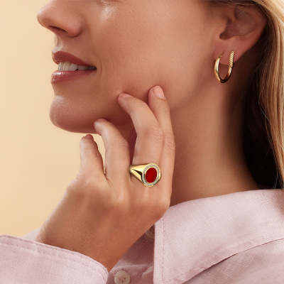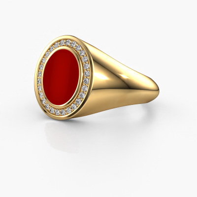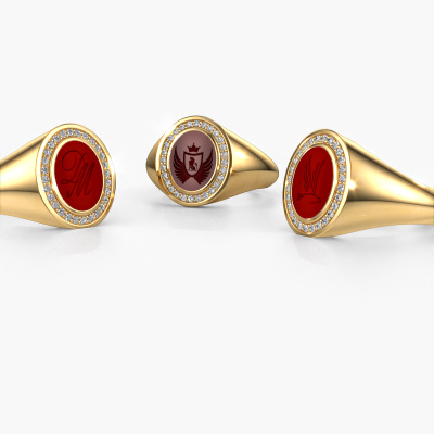 Deze gouden dames zegelring getuigt van een echt stukje vakmanschap. Deze bijzondere zegelring heeft de naam Hilda 1 en is gezet met een ovale vorm carneool. In ons atelier combineren wij de meest innovatieve technieken met het pure ambacht van goudsmeden, waardoor tot in het kleinste detail prachtige ringen ontstaan. Voor onze goudsmeden zijn vooral ringen fascinerende juwelen. In de zegel kan een familiewapen of een initiaal gegraveerd worden en vooral ringen met familiewapen kunnen soms tradities lang doorgegeven worden. Daarbij is een zegelring een prachtig, stijlvol juweel, dat tegenwoordig weer helemaal in is. Reden genoeg om de familietraditie voort te zetten of een nieuwe traditie te beginnen! Bekijk gerust al onze mogelijkheden voor het graveren van jouw zegelring in onze kennisbank onderaan deze pagina! Wat denk je van deze fantasie gouden zegelring? Deze Hilda 1 zegelring stel je helemaal zelf samen met onze configurator. Vervolgens wordt jouw persoonlijke bijzondere Hilda 1 zegelring met de hand gemaakt door onze goudsmeden. De keuze van het edelmetaal en de edelstenen kun je helemaal naar eigen wens invullen. Heb je bepaalde ideeën voor jouw zegelring, maar kun je deze niet bij onze opties vinden? Laat het ons dan gerust weten. Wij maken jouw persoonlijke fantasie zegelring geheel naar jouw wensen.Met veel passie gaan onze edelsmeden met jouw ring aan de slag in ons atelier, zodra je deze besteld hebt. Doordat we geen sieraden op voorraad hebben, hoeven we de voorraad niet door te berekenen in de prijs. En dat zie je terug in de prijs! We geven je graag een beste prijsgarantie.Om het voor jou makkelijker te maken kun je ieder besteld sieraad binnen 30 dagen na aflevering eenvoudig weer retour sturen.Ben je klaar om jouw bijzondere Hilda 1 zegelring samen te stellen, maar heb je nog vragen? Stel deze dan gerust. Ons team van ervaren en gepassioneerde goudsmeden staat voor je klaar!