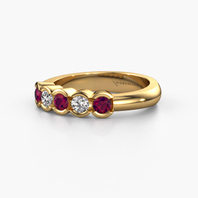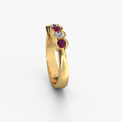 Deze ring heeft de naam Lotte 5, deze ring uitgevoerd in 14 Carat goud is gezet met rhodoliet ter grootte van 3 mm. Ben je op zoek naar een unieke gouden ring met een moderne uitstraling? Dan is dit een mooie ring, die je zelf naar jouw of haar smaak verder kunt aanpassen. Perfect voor de eigentijdse, moderne vrouw! In deze 5 steens ring is prachtige rhodoliet verwerkt. Deze is zorgvuldig geselecteerd, want op jouw ring mag alleen de mooiste edelsteen schitteren. Onze goudsmid vervaardigt jouw ring in ons eigen atelier, en plaatst de rhodoliet met uiterste precisie in de ring. Vervolgens wordt deze bijgewerkt en gepolijst totdat het resultaat zichtbaar is: de perfecte ring!Door het gebruik van de modernste technieken, gecombineerd met ambachtelijk vakmanschap kunnen wij alle ringen zelf in ons atelier maken. Iedere ring wordt pas gemaakt nadat deze besteld is. Dit heeft als bijkomend voordeel dat we kunnen leveren tegen een prijs die je nergens anders tegenkomt.Elke dag worden nieuwe ring ontwerpen toegevoegd aan de site door ons team van talentvolle en gepassioneerde ontwerpers. Hierbij wordt ernaar gestreefd om een zo gevarieerd mogelijke collectie aan te bieden. Heb je bepaalde ideeën voor een ring, neem dan eens contact op voor een offerte. Wij doen je een aanbod wat betreft prijs en kwaliteit waar je geen nee tegen zult kunnen zeggen.Om het voor jou makkelijker te maken kun je ieder besteld sieraad binnen 30 dagen na aflevering eenvoudig weer retour sturen.
