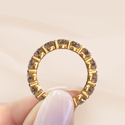 Deze exclusieve gouden ring, met de naam Heddy rnd 4.2, is een puur staaltje vakmanschap! De ring is uitgevoerd in 14 Carat goud en is gezet met ronde bruine diamant van 4.50 crt. De kleinste details zijn door onze goudsmid met veel geduld en passie vervaardigd. Dit echte ambacht vraagt een deskundig oog en vaardige hand om deze ring met uiterste precisie samen te stellen. En dat is precies waar onze goudsmeden enthousiast van worden! De prachtige bruine diamanten worden op een speciale manier gezet, zodat deze nog beter tot zijn recht komen. Dit geeft de ring extra allure. De ring is al uniek door zijn natuurlijke edelsteen, die wij speciaal geselecteerd hebben voor deze Heddy rnd 4.2 ring. En door jouw keuze voor edelmetaal creëer jij zelf een unieke ring. Het mooie aan deze eternity ring is, dat je deze helemaal zelf kunt samenstellen. Jouw stijl, jouw keuze, jouw ring. Bovendien wordt jouw exclusieve gouden ring met de hand gemaakt, met eerlijke materialen! Met onze configurator pas je dit gemakkelijk aan.Onze goudsmeden vervaardigen pas je ring, zodra je deze besteld hebt. We hebben geen voorraden. Het voordeel hiervan is dat we de voorraad niet door hoeven te berekenen in de prijs, en wij daardoor sieraden kunnen leveren tegen een bijzonder lage prijs.Om het voor jou makkelijker te maken kun je ieder besteld sieraad binnen 30 dagen na aflevering eenvoudig weer retour sturen.Heb je misschien nog vragen? Wil je een bestaand ontwerp aanpassen met je eigen ideeën? Ook dan neem je contact met ons op. Ons team van vakmensen dient je graag van advies bij het creëren van jouw exclusief droom juweel.