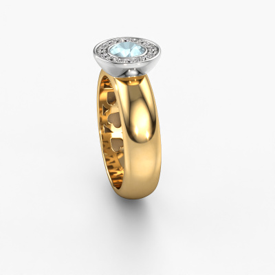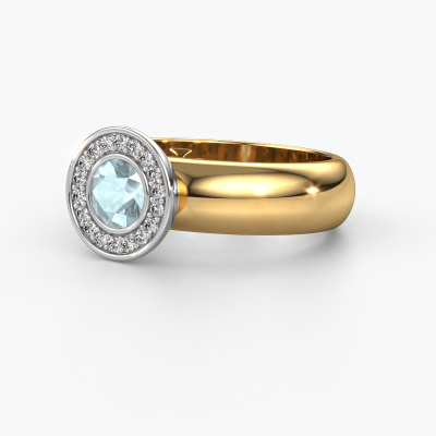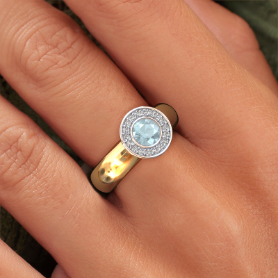 Bovenstaande ring heeft de naam Anna, dit type ring noemen we een Halo ring. De ring is uitgevoerd in 14 Carat goud en heeft als middensteen een ronde aquamarijn ter grootte van 5 mm en eromheen zijn kleine diamanten gezet. Bij deze halo gouden halo ring zijn de kleinere edelstenen rondom de grote aquamarijn zijn gezet. Daar heeft deze ring zijn naam ook door heeft gekregen: halo betekent lichtkrans en dat is waar de kleinere edelstenen voor zorgen. Deze kleinere edelstenen moeten dan echter wel allen op dezelfde manier geplaatst zijn, zodat het licht niet doorbroken wordt in de aquamarijn en er inderdaad een prachtige lichtkrans gecreëerd wordt. En daar zorgen onze meestergoudsmeden voor. Met uiterste precisie wordt iedere zorgvuldig geselecteerde aquamarijn met de hand in de ring geplaatst. Steeds opnieuw wordt de ring tegen het licht gehouden om te zien of het speciale effect nog steeds zichtbaar is. Het resultaat is een unieke ring, waarbij de gekozen aquamarijn letterlijk het stralende middelpunt wordt. Een prachtige ring!De halo Anna ring zoals je hier afgebeeld ziet, kan helemaal naar jouw wensen verpersoonlijkt worden. De mogelijkheden met onze configurator zijn zeer uitgebreid, maar mocht je toch iets aan jouw persoonlijke Anna ring willen aanpassen wat niet als optie geboden wordt, dan kun je altijd contact met ons opnemen.Ben je gebonden aan een bepaald budget? Neem gerust contact met ons op, we adviseren graag over alle mogelijkheden. Sowieso leveren wij alle ringen tegen een prijs die je nergens anders tegen komt, doordat we de ring pas vervaardigen wanneer je deze besteld. Hierdoor kunnen wij je een beste prijs garantie geven.Om het voor jou makkelijker te maken kun je ieder besteld sieraad binnen 30 dagen na aflevering eenvoudig weer retour sturen.Wil je jouw unieke Anna ring ontwerpen, maar zijn bepaalde dingen je nog niet duidelijk? Neem dan even een kijkje op onze pagina met veelgestelde vragen, of neem contact op met ons team van ervaren vakmensen.