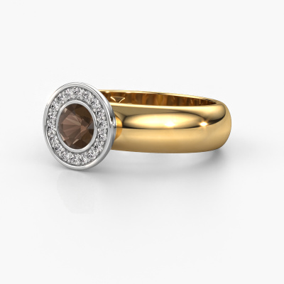 Bovenstaande ring heeft de naam Anna, dit type ring noemen we een Halo ring. De ring is uitgevoerd in 14 Carat goud en heeft als middensteen een ronde rookkwarts ter grootte van 5 mm en eromheen zijn kleine diamanten gezet. Bij deze halo gouden halo ring zijn de kleinere edelstenen rondom de grote rookkwarts zijn gezet. Daar heeft deze ring zijn naam ook door heeft gekregen: halo betekent lichtkrans en dat is waar de kleinere edelstenen voor zorgen. Deze kleinere edelstenen moeten dan echter wel allen op dezelfde manier geplaatst zijn, zodat het licht niet doorbroken wordt in de rookkwarts en er inderdaad een prachtige lichtkrans gecreëerd wordt. En daar zorgen onze meestergoudsmeden voor. Met uiterste precisie wordt iedere zorgvuldig geselecteerde rookkwarts met de hand in de ring geplaatst. Steeds opnieuw wordt de ring tegen het licht gehouden om te zien of het speciale effect nog steeds zichtbaar is. Het resultaat is een unieke ring, waarbij de gekozen rookkwarts letterlijk het stralende middelpunt wordt. Een prachtige ring!De halo Anna ring zoals je hier afgebeeld ziet, kan helemaal naar jouw wensen verpersoonlijkt worden. De mogelijkheden met onze configurator zijn zeer uitgebreid, maar mocht je toch iets aan jouw persoonlijke Anna ring willen aanpassen wat niet als optie geboden wordt, dan kun je altijd contact met ons opnemen.Ben je gebonden aan een bepaald budget? Neem gerust contact met ons op, we adviseren graag over alle mogelijkheden. Sowieso leveren wij alle ringen tegen een prijs die je nergens anders tegen komt, doordat we de ring pas vervaardigen wanneer je deze besteld. Hierdoor kunnen wij je een beste prijs garantie geven.Om het voor jou makkelijker te maken kun je ieder besteld sieraad binnen 30 dagen na aflevering eenvoudig weer retour sturen.Wil je jouw unieke Anna ring ontwerpen, maar zijn bepaalde dingen je nog niet duidelijk? Neem dan even een kijkje op onze pagina met veelgestelde vragen, of neem contact op met ons team van ervaren vakmensen.