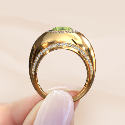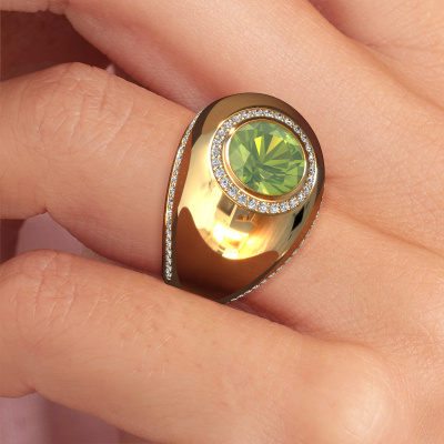 Deze edelstenen gouden ring Roxann is een prachtige ring. In de ring wordt speciaal geselecteerde peridoot gezet. Een design ring, die getuigt van een vrouw met stijl. De ring is ontworpen door onze eigen juwelen designers. Doordat in ons atelier de