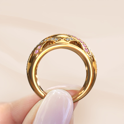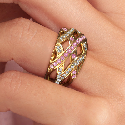 Deze ring heeft de naam Yinthe, deze ring uitgevoerd in 14 Carat goud is gezet met roze saffier. Ben je op zoek naar een unieke gouden ring met een fantasie uitstraling? Dan is dit een mooie ring, die je zelf naar jouw of haar smaak verder kunt aanpassen. Perfect voor de eigentijdse, fantasie vrouw! In deze hedendaagse ring is een prachtige roze saffier verwerkt. Deze is zorgvuldig geselecteerd, want op jouw ring mag alleen de mooiste edelsteen schitteren. Onze goudsmid vervaardigt jouw ring in ons eigen atelier, en plaatst de roze saffier met uiterste precisie in de ring. Vervolgens wordt deze bijgewerkt en gepolijst totdat het resultaat zichtbaar is: de perfecte ring!Door onze modernste technieken kunnen wij met uiterste precisie prachtige sieraden te ontwerpen en voor jou personaliseren in de hoogste juwelierskwaliteit. Tegelijkertijd zijn onze ringen altijd 30% goedkoper dan bij een andere juwelier. Dit komt doordat alle ringen pas vervaardigd worden op het moment dat deze besteld wordt en we daardoor geen dure voorraden hoeven te hanteren. Mocht je aan een bepaald budget gebonden zijn, kunnen we je graag adviseren welke combinatie je het beste kunt kiezen.Onze talentvolle ontwerpers voegen elke dag nieuwe designs toe aan de website, en werken samen om tot een zo gevarieerd mogelijke collectie te komen met de mooiste sieraden. Wil je een ring laten maken naar eigen ontwerp, neem dan eens contact met ons op voor een offerte. Graag doen wij je een aanbod, waarvan wij denken dat je wat betreft kwaliteit en prijs versteld zult staan.Om het voor jou makkelijker te maken kun je ieder besteld sieraad binnen 30 dagen na aflevering eenvoudig weer retour sturen.We zijn benieuwd hoe je jouw Yinthe ring gaat personaliseren. Is iets je niet geheel duidelijk, dan kun je natuurlijk altijd contact opnemen. We helpen je graag!