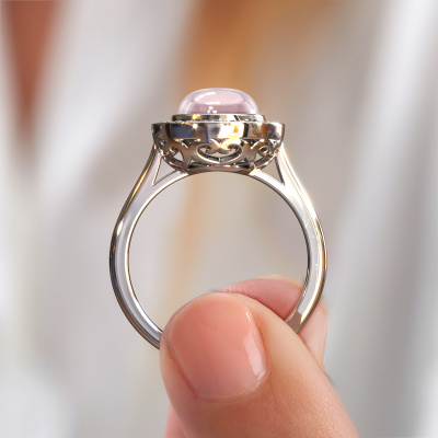 Wil je een mooie, royale ring met een enkele edelsteen als eyecatcher? Wat denk je dan van deze Alisa ring? De Alisa ring zie je hier afgebeeld in platina met een prachtige 8 mm ronde cabochon morganiet champagne. De morganiet champagne wordt met zeer zorgvuldig uitgezocht door onze leveranciers van morganiet champagne, en daarna volgens het oude ambacht door de goudsmid geplaatst in de ring. Deze wordt tot in het kleinste detail afgewerkt en gepolijst totdat een unieke ring is ontstaan met een prachtige morganiet champagne. Speciaal voor jou vervaardigd!Het mooiste cadeau wat je kunt geven, is een zelfontworpen fantasie ring. Ons team van gepassioneerde goudsmeden voegt iedere dag de mooiste nieuwe ontwerpen toe. En elk ontwerp kun je naar jouw wens aanpassen. Zo heb je de keuze welk edelmetaal gebruikt wordt, en kun je de kleur kiezen van de edelstenen. Zo wordt jouw fantasie Alisa ring ontwerp geheel uniek!Wil je jouw Alisa ring laten graveren, dan kun je dit doorgeven bij je bestelling. Wij zorgen ervoor dat je ring helemaal naar wens wordt vervaardigd. Ben je gebonden aan een bepaald budget? Neem gerust contact met ons op, we adviseren graag over alle mogelijkheden. Sowieso leveren wij alle ringen tegen een prijs die je nergens anders tegen komt, doordat we de ring pas vervaardigen wanneer je deze besteld. Hierdoor kunnen wij je een beste prijs garantie geven.Om het voor jou makkelijker te maken kun je ieder besteld sieraad binnen 30 dagen na aflevering eenvoudig weer retour sturen.Heb je vragen, dan kun je altijd een kijkje nemen bij onze veelgestelde vragen. Kom je er niet uit, of zie je het antwoord op je vraag er niet bij staan, neem dan gerust contact op met het DiamondsByMe team!