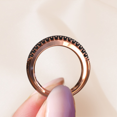 Deze Pavé ring heeft de naam Kati. Deze ring is uitgevoerd in 14 Carat rosé goud en is gezet met zwarte diamanten 1.44 crt. In deze rosé gouden ring zijn prachtige zwarte diamanten gezet, als een oneindige rij met zwarte diamanten. De edelstenen worden zorgvuldig uitgekozen en met uiterste precisie geplaatst door onze goudsmid. Want alleen wanneer de zwarte diamanten precies gelijk naast elkaar worden gezet, gaat de ring schitteren. Steeds weer tijdens het ambachtelijke proces van smeden en polijsten houdt de goudsmid jouw ring in het licht, totdat hij uiteindelijk de perfecte ring in handen houdt. Door jou samengesteld en speciaal gecreëerd voor jou! Het mooie aan deze pavé gezette ring is, dat je deze helemaal zelf kunt samenstellen. Jouw stijl, jouw keuze, jouw ring. Bovendien wordt jouw exclusieve rosé gouden ring met de hand gemaakt, met eerlijke materialen! Met onze configurator pas je dit gemakkelijk aan.Met veel passie gaan onze edelsmeden met jouw ring aan de slag in ons atelier, zodra je deze besteld hebt. Doordat we geen sieraden op voorraad hebben, hoeven we de voorraad niet door te berekenen in de prijs. En dat zie je terug in de prijs! We geven je graag een beste prijsgarantie.Om het voor jou makkelijker te maken kun je ieder besteld sieraad binnen 30 dagen na aflevering eenvoudig weer retour sturen.Uiteraard staan we je graag bij bij het samenstellen van jouw Kati droom ring. Heb je vragen, aarzel dan niet om contact met ons op te nemen!