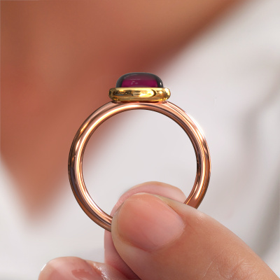 Op de afbeelding zie je de rosé gouden ring Blossom OVL met een cabochon geslepen granaat. Cabochon betekent dat de granaat eerst in een specifieke vorm geslepen wordt, zoals een druppelvorm, hart of ovaal en daarna worden er vanaf de bovenkant laagjes afgeslepen totdat de steen een prachtig bolle vorm heeft gekregen. Een juweel met een cabochon geslepen edelsteen is een prachtige, stijlvolle eyecatcher dat perfect matcht bij zowel een fantasie stijl als meer een vintage stijl. Je elegante ring wordt door onze goudsmeden tot in de kleinste details afgewerkt totdat jouw unieke ring is ontstaan, waarin de cabochon geslepen granaat helemaal tot zijn recht komt. Jouw persoonlijke elegante Blossom OVL ring stel je zelf samen, en wordt met liefde en passie door onze goudsmeden vervaardigd. Wil je liever een andere optie dan de hier afgebeelde rosé gouden Blossom OVL ring? Dan heb je via de configurator keuze uit diverse mogelijkheden. Kom je er niet helemaal uit, dan dienen wij je graag van advies!Door het gebruik van de modernste technieken, gecombineerd met ambachtelijk vakmanschap kunnen wij alle ringen zelf in ons atelier maken. Iedere ring wordt pas gemaakt nadat deze besteld is. Dit heeft als bijkomend voordeel dat we kunnen leveren tegen een prijs die je nergens anders tegenkomt.Om het voor jou makkelijker te maken kun je ieder besteld sieraad binnen 30 dagen na aflevering eenvoudig weer retour sturen.Uiteraard kun je altijd contact met ons opnemen, wanneer je hulp kunt gebruiken bij het samenstellen van jouw Blossom OVL ring!
