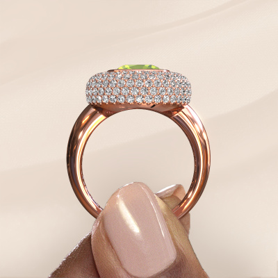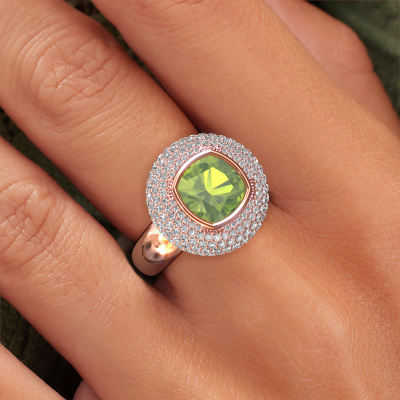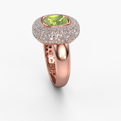 Deze exclusieve rosé gouden ring, met de naam Keshia, is een puur staaltje vakmanschap! De ring is uitgevoerd in 14 Carat rosé goud en is gezet met cushion peridoot van 8 mm. De kleinste details zijn door onze goudsmid met veel geduld en passie vervaardigd. Dit echte ambacht vraagt een deskundig oog en vaardige hand om deze ring met uiterste precisie samen te stellen. En dat is precies waar onze goudsmeden enthousiast van worden! De prachtige peridoot worden op een speciale manier gezet, zodat deze nog beter tot zijn recht komen. Dit geeft de ring extra allure. De ring is al uniek door zijn natuurlijke edelsteen, die wij speciaal geselecteerd hebben voor deze Keshia ring. En door jouw keuze voor edelmetaal creëer jij zelf een unieke ring. Onze goudsmeden vervaardigen met veel passie en zorgvuldigheid jouw ring op maat en naar eigen wens. De rosé gouden ring zoals hier is afgebeeld, kan naar jouw wens worden aangepast met de configurator. Heb je bepaalde ideeën die je met de configurator niet kunt toepassen, dan kun je dit altijd opnemen met onze sieradenontwerpers. Met vragen kun je uiteraard ook altijd terecht.Door onze modernste technieken kunnen wij met uiterste precisie prachtige sieraden te ontwerpen en voor jou personaliseren in de hoogste juwelierskwaliteit. Tegelijkertijd zijn onze ringen altijd 30% goedkoper dan bij een andere juwelier. Dit komt doordat alle ringen pas vervaardigd worden op het moment dat deze besteld wordt en we daardoor geen dure voorraden hoeven te hanteren. Mocht je aan een bepaald budget gebonden zijn, kunnen we je graag adviseren welke combinatie je het beste kunt kiezen.Om het voor jou makkelijker te maken kun je ieder besteld sieraad binnen 30 dagen na aflevering eenvoudig weer retour sturen.Heb je misschien nog vragen? Wil je een bestaand ontwerp aanpassen met je eigen ideeën? Ook dan neem je contact met ons op. Ons team van vakmensen dient je graag van advies bij het creëren van jouw exclusief droom juweel.
