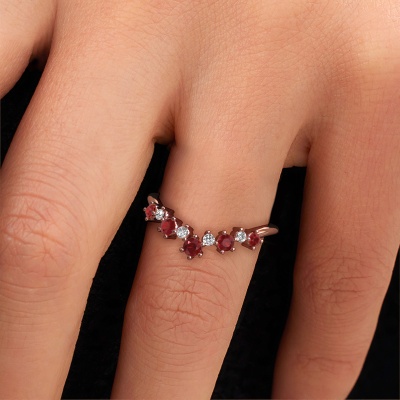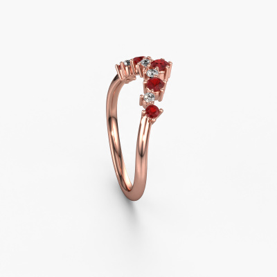 Deze Carly B aanschuifring in 14 Carat rosé goud is gezet met robijn. Deze rosé gouden aanschuifring, met de naam Carly B, maakt jouw ringen collectie compleet. Zoals de naam het al zegt, is het een aanschuifring die naast een andere aanschuifring aan dezelfde vinger geschoven kan worden. Hierdoor kun jij je eigen stijl prachtig weergeven. Een aanschuifring wordt ook wel gekoppeld aan herinneringen, bijvoorbeeld aan een bijzonder persoon of een moment dat je niet meer wilt vergeten. Bij een huwelijksjubileum wordt er ook vaak gekozen voor een aanschuifring bij de trouwringen. Maar ook als stijlvolle mode-accessoire komt deze fashionable aanschuifring naast jouw andere ringen helemaal tot zijn recht. Zodra je jouw Carly B aanschuifring hebt ontworpen met onze configurator, gaan onze goudsmeden aan de slag om deze voor je te vervaardigen. Dit gebeurt op ambachtelijke wijze met passie en zorgvuldigheid. Bovendien werken wij met eerlijk gewonnen materialen. Wil je iets aanpassen, dan doe je dat met onze configurator. Heb je specifieke wensen voor jouw Carly B aanschuifring, maar zie je deze niet als optie staan in de configurator, neem dan contact op met ons team van ervaren ontwerpers.Onze goudsmeden vervaardigen pas je ring, zodra je deze besteld hebt. We hebben geen voorraden. Het voordeel hiervan is dat we de voorraad niet door hoeven te berekenen in de prijs, en wij daardoor sieraden kunnen leveren tegen een bijzonder lage prijs.Om het voor jou makkelijker te maken kun je ieder besteld sieraad binnen 30 dagen na aflevering eenvoudig weer retour sturen.Heb je vragen over het samenstellen van jouw fashionable Carly B fashionable ring? Geen enkel probleem. Neem contact met ons op, en ons team van juwelenontwerpers helpt je verder.
